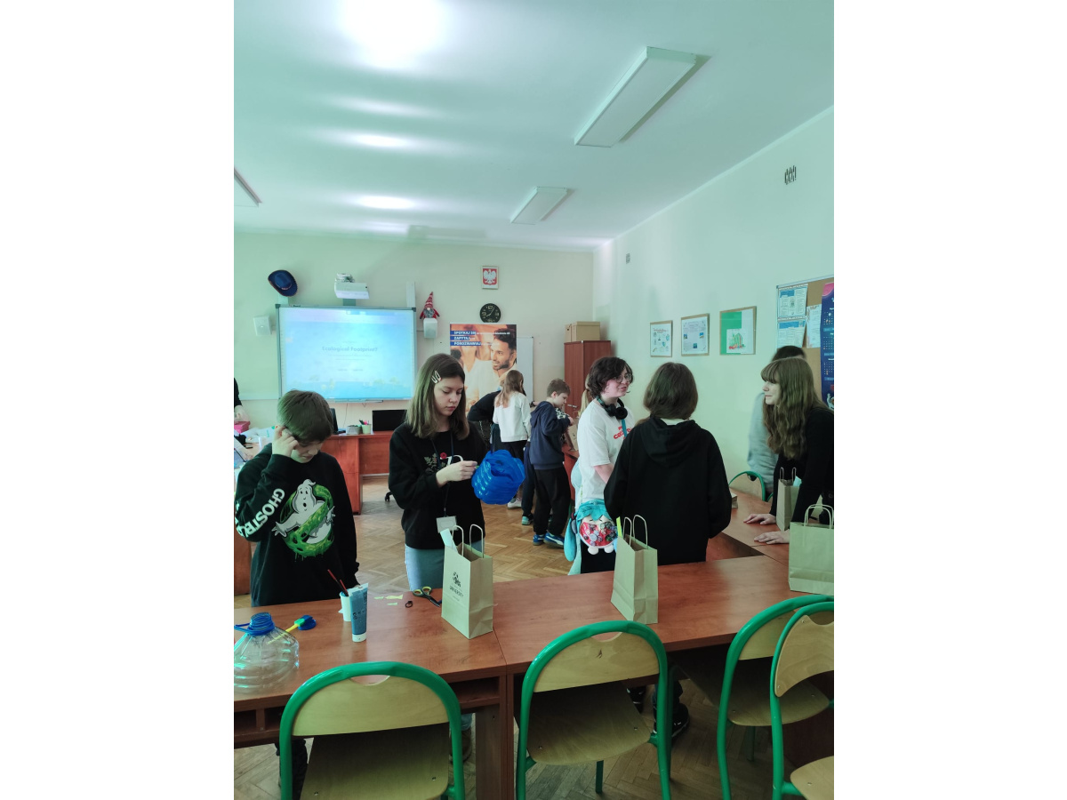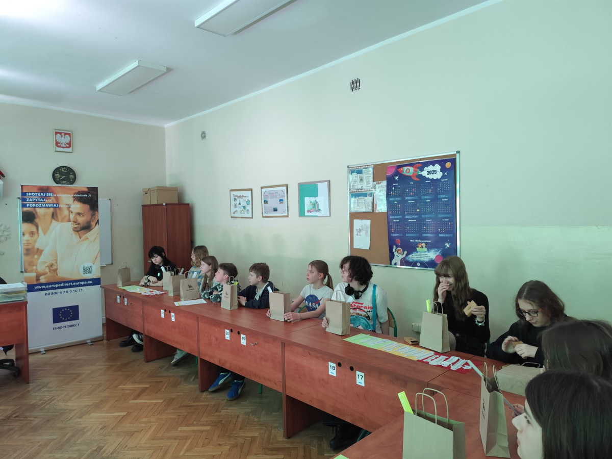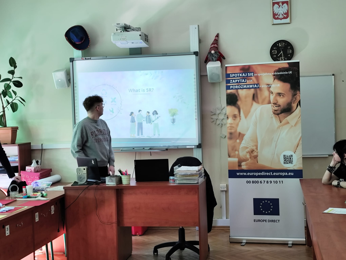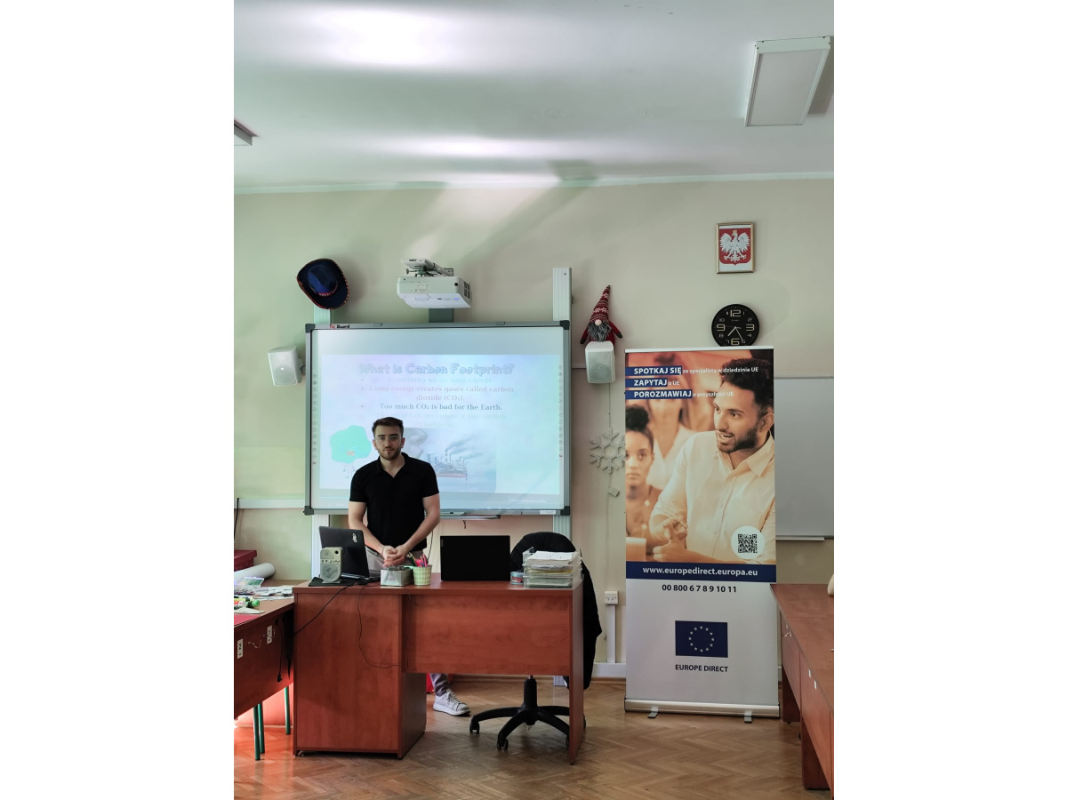 Pani M. Smarz nawiązała współpracę z punktem informacyjnym Europe Direct w Bydgoszczy. Wolontariusze zaproszeni do naszej szkoły poprowadzili zajęcia z ekologii w języku angielskim. Na początku byliśmy onieśmieleni, ale później odważnie komunikowaliśmy się w języku Szekspira. Jesteśmy bardzo zadowoleni. Zajęcia były interesujące i pozwoliły nam wykazać się kreatywnością.