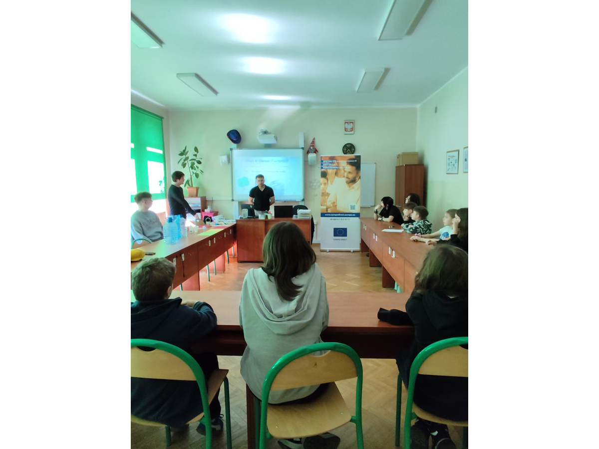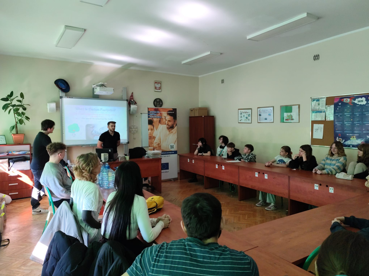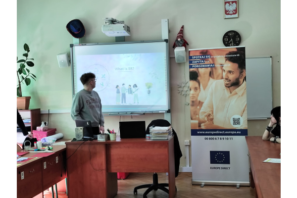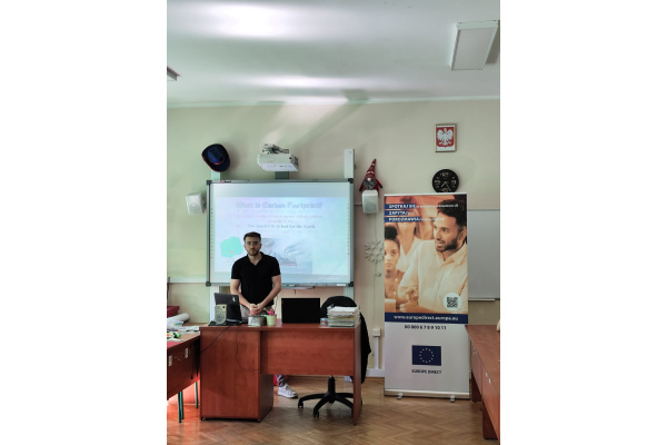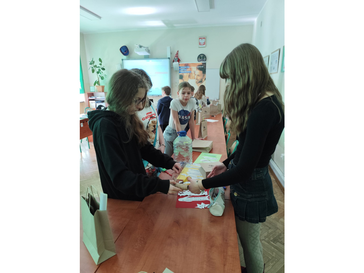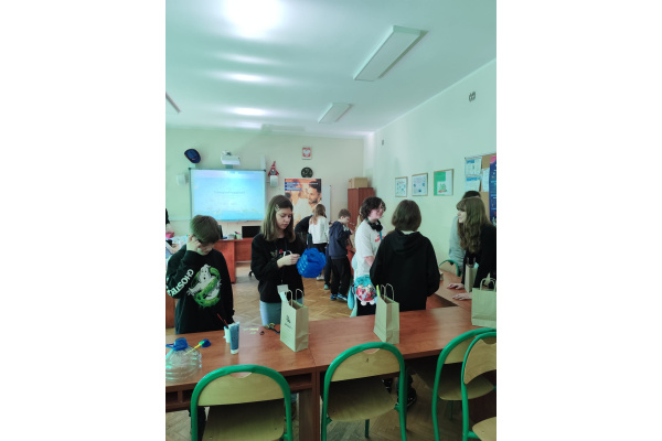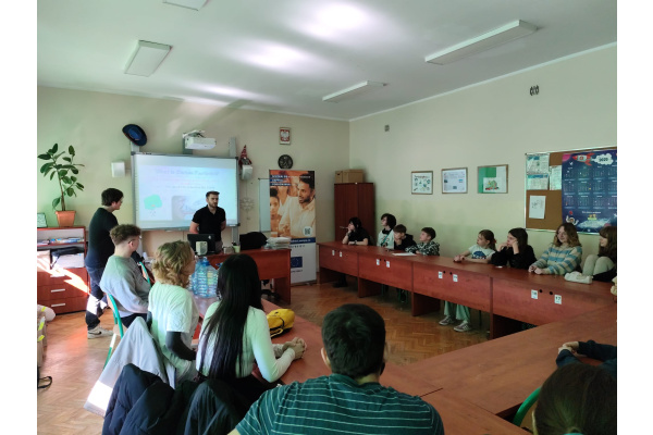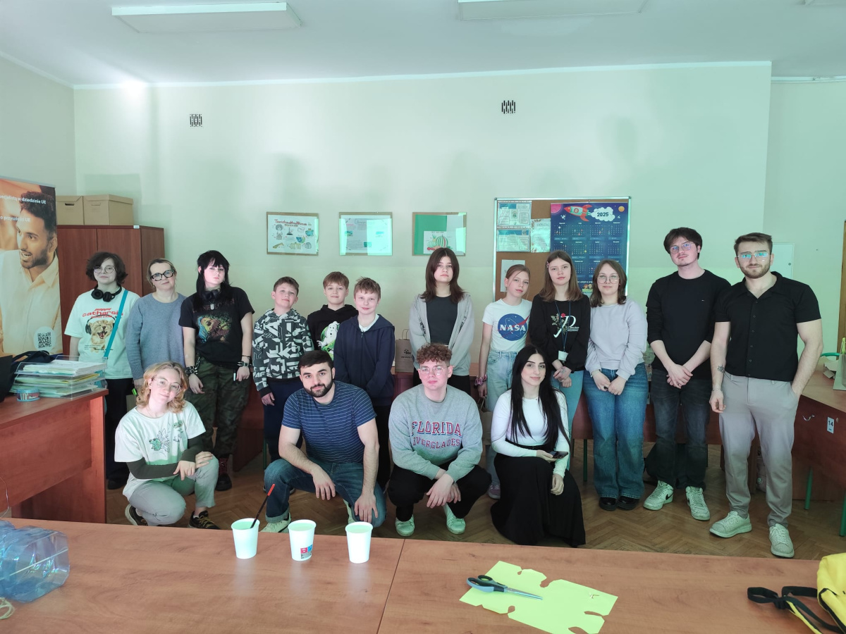 Pani M. Smarz nawiązała współpracę z punktem informacyjnym Europe Direct w Bydgoszczy. Wolontariusze zaproszeni do naszej szkoły poprowadzili zajęcia z ekologii w języku angielskim. Na początku byliśmy onieśmieleni, ale później odważnie komunikowaliśmy się w języku Szekspira. Jesteśmy bardzo zadowoleni. Zajęcia były interesujące i pozwoliły nam wykazać się kreatywnością.