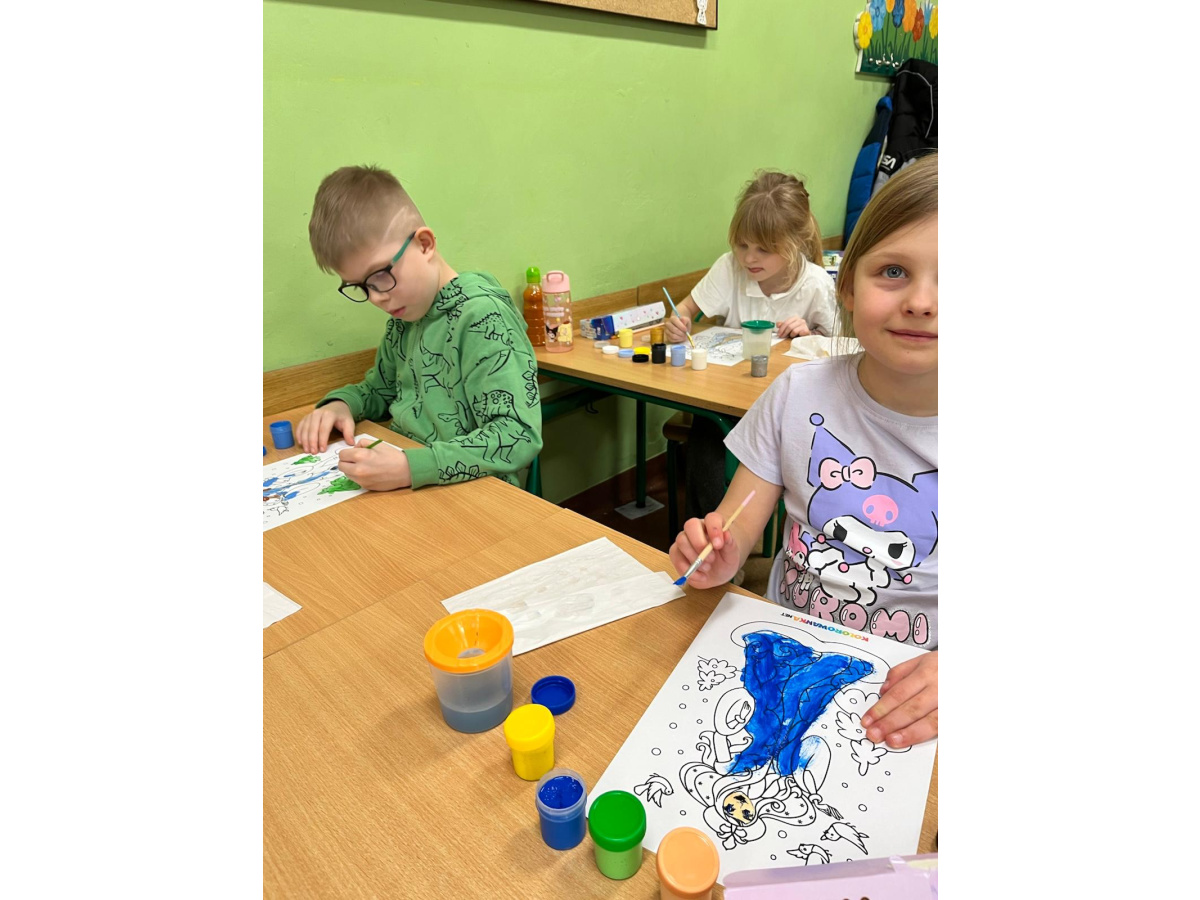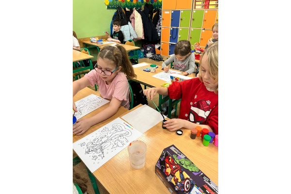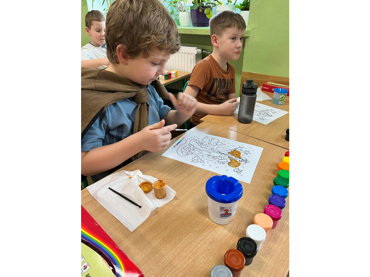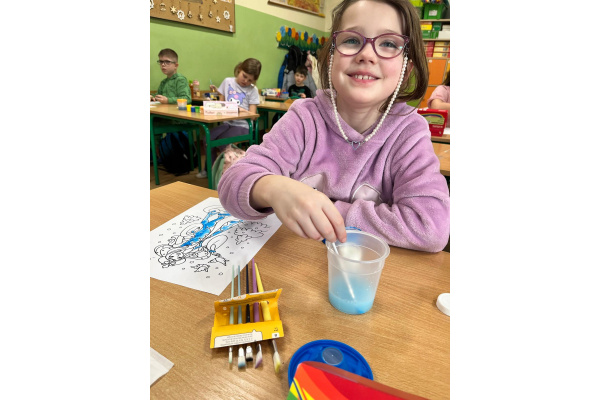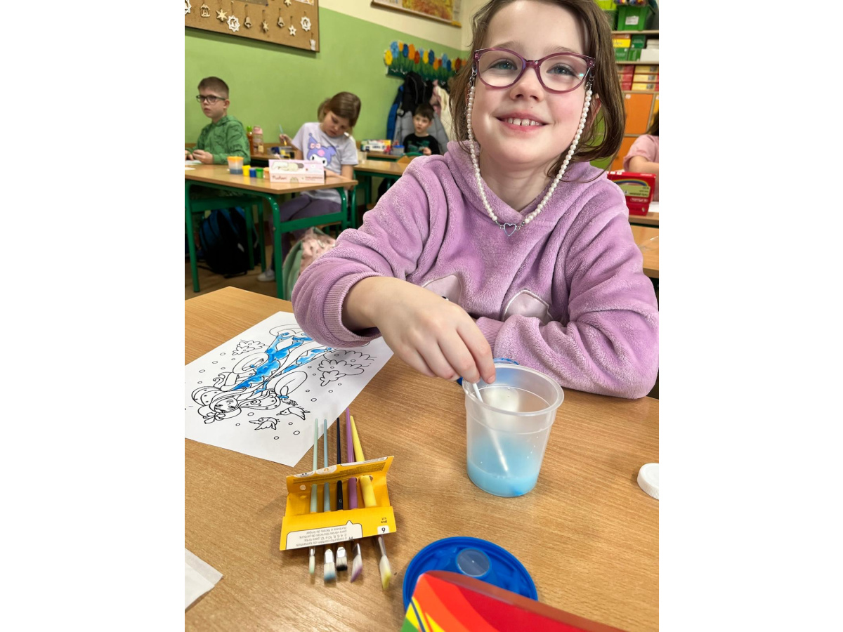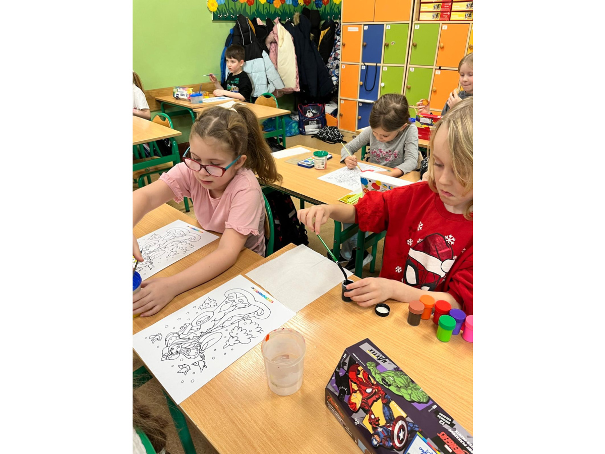 Uczniowie klasy 1b na zajęciach plastycznych malowali farbami postać Pani Zimy. Dzieci z dużym zaangażowaniem i radością tworzyły swoje prace, wykorzystując różnorodne kolory i techniki malarskie. Każda praca była wyjątkowa i pokazywała wizję Pani Zimy z dodatkami – pełną śniegu, mrozu i zimowych detali. Zajęcia rozwijały wyobraźnię, kreatywność oraz sprawność manualną uczniów, a także sprawiły im wiele radości.