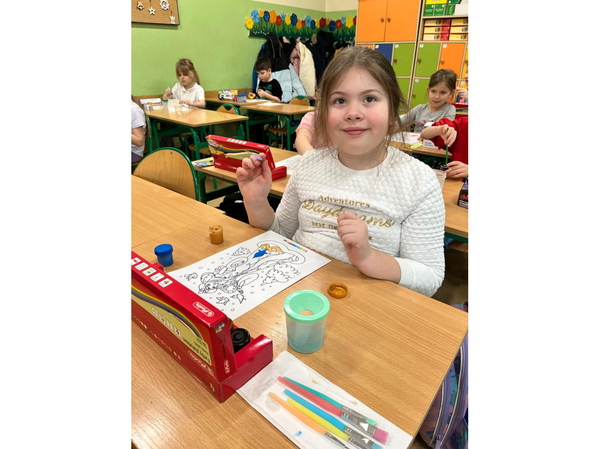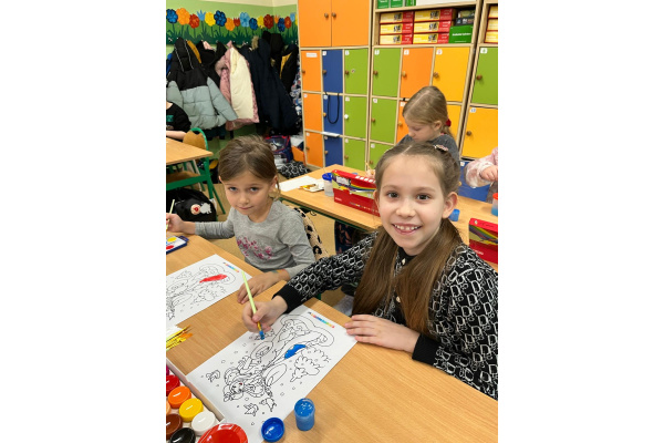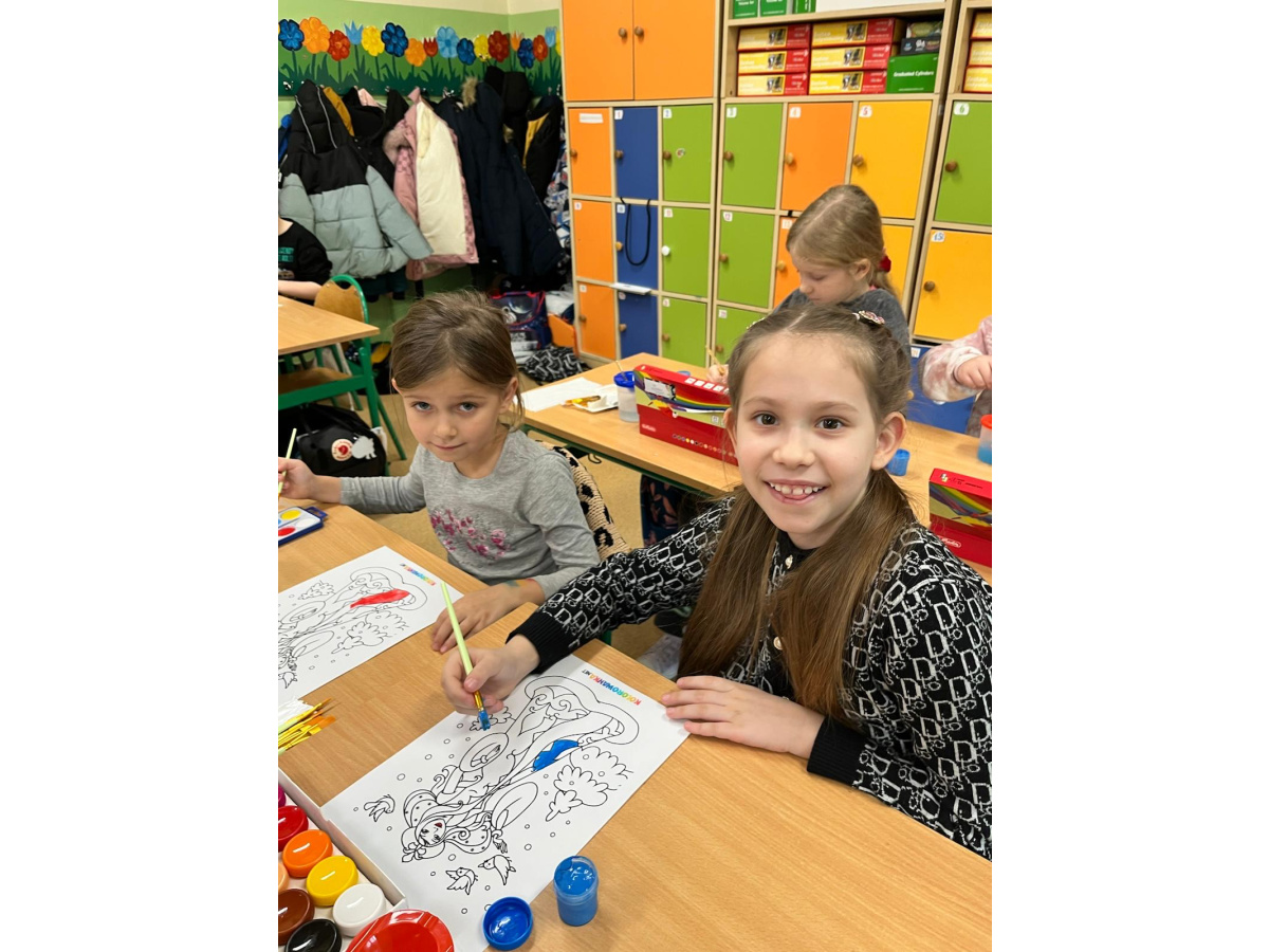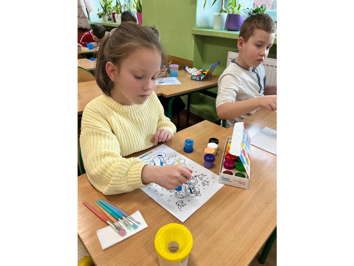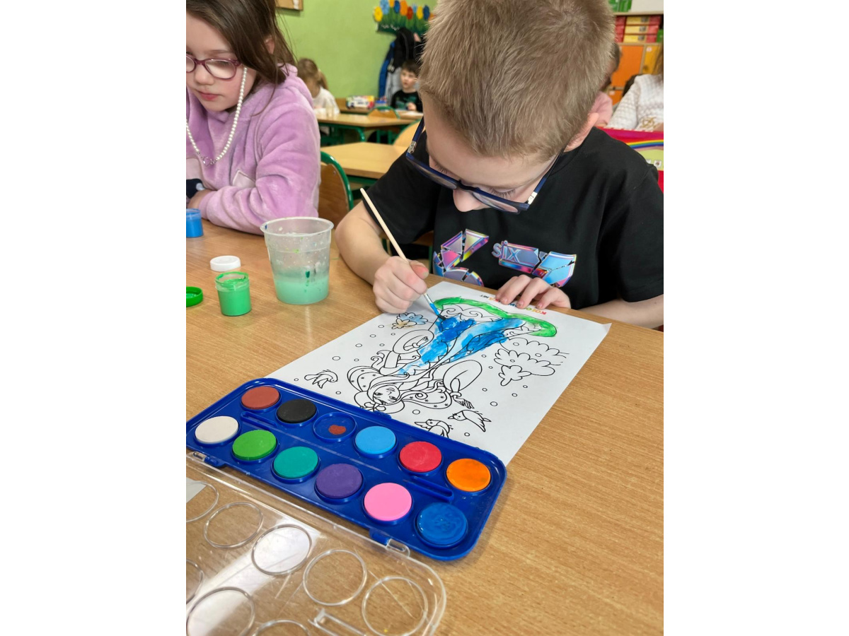 Uczniowie klasy 1b na zajęciach plastycznych malowali farbami postać Pani Zimy. Dzieci z dużym zaangażowaniem i radością tworzyły swoje prace, wykorzystując różnorodne kolory i techniki malarskie. Każda praca była wyjątkowa i pokazywała wizję Pani Zimy z dodatkami – pełną śniegu, mrozu i zimowych detali. Zajęcia rozwijały wyobraźnię, kreatywność oraz sprawność manualną uczniów, a także sprawiły im wiele radości.