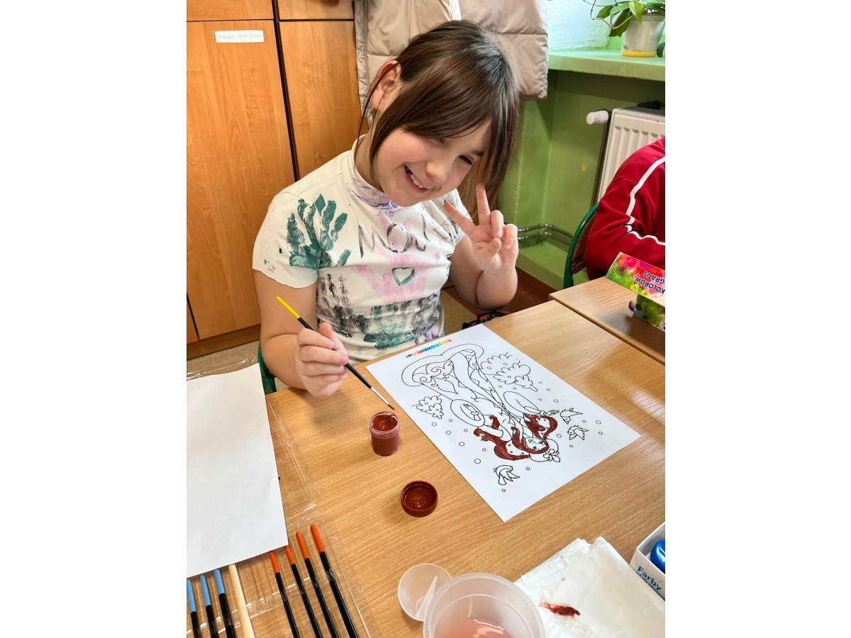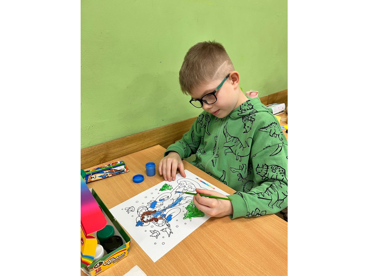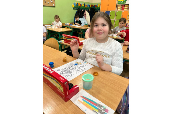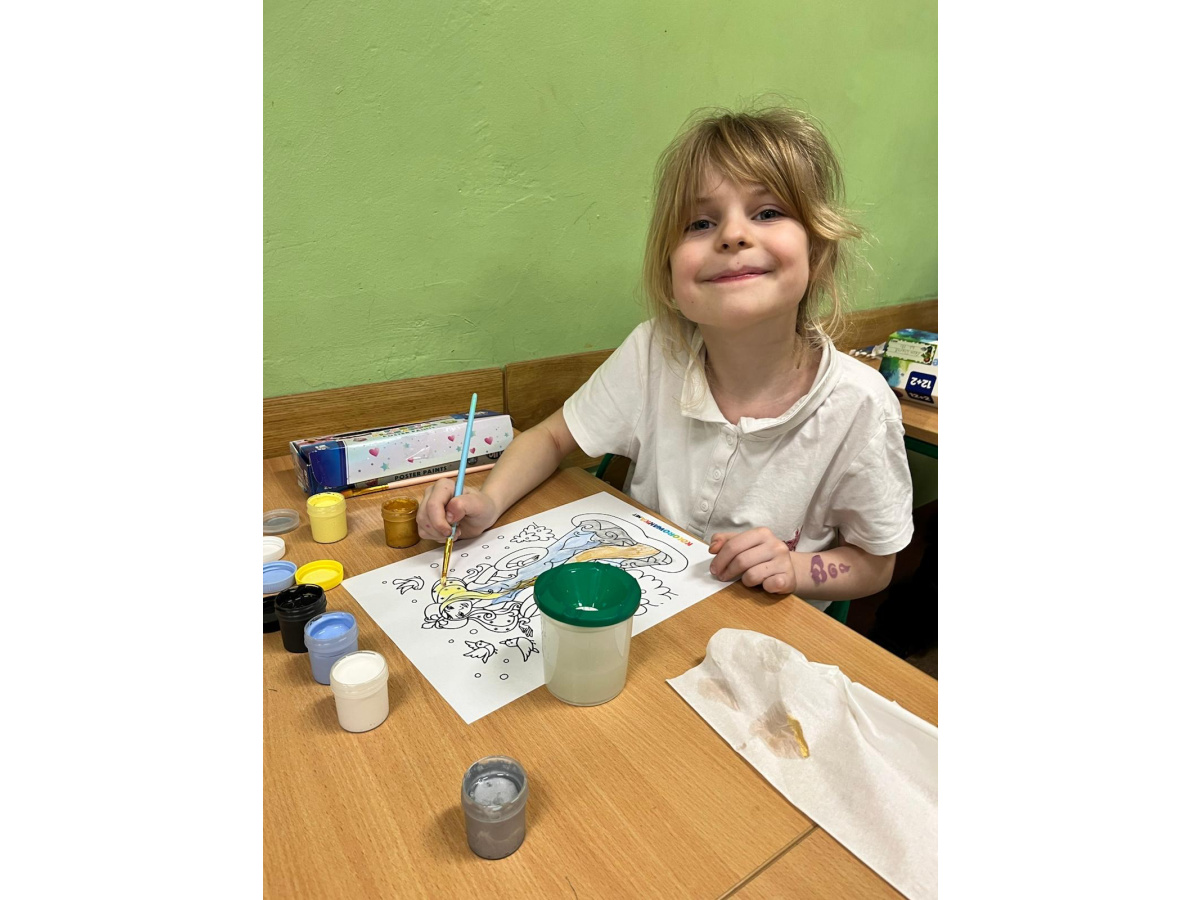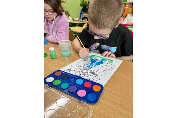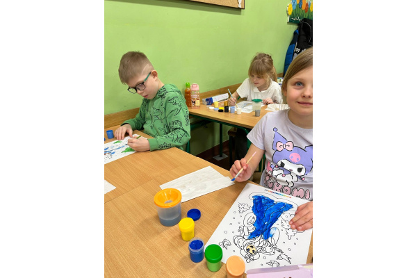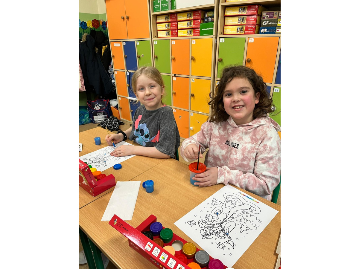 Uczniowie klasy 1b na zajęciach plastycznych malowali farbami postać Pani Zimy. Dzieci z dużym zaangażowaniem i radością tworzyły swoje prace, wykorzystując różnorodne kolory i techniki malarskie. Każda praca była wyjątkowa i pokazywała wizję Pani Zimy z dodatkami – pełną śniegu, mrozu i zimowych detali. Zajęcia rozwijały wyobraźnię, kreatywność oraz sprawność manualną uczniów, a także sprawiły im wiele radości.