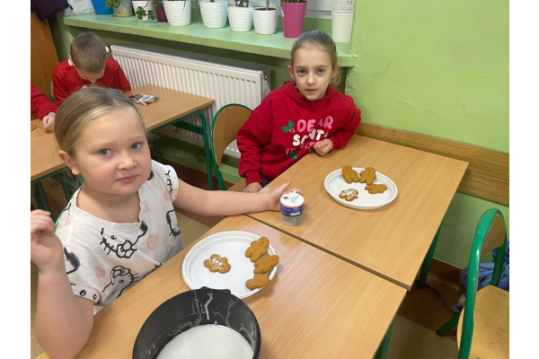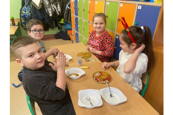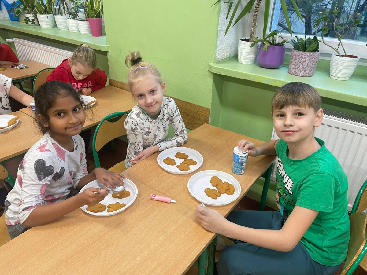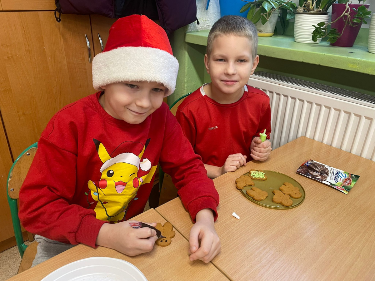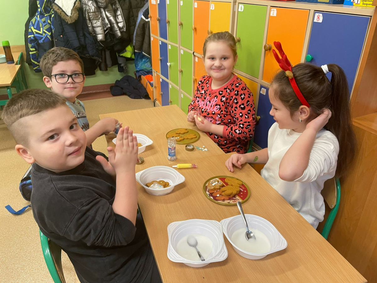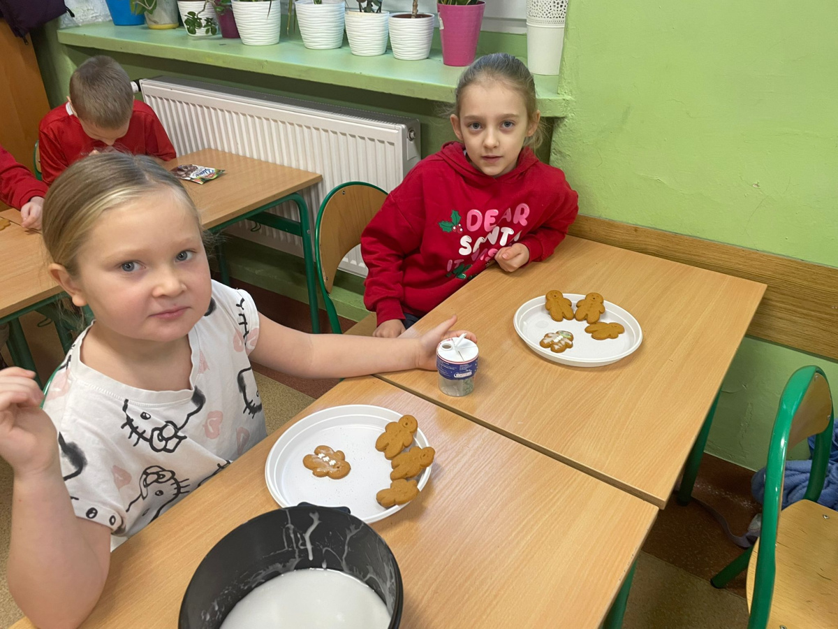 Klasa 2a wzięła udział w zajęciach plastyczno-kulinarnych. Uczniowie z ogromnym zaangażowaniem ozdabiali świąteczne pierniki. Na stołach pojawiły się kolorowe lukry, posypki i cukrowe dekoracje, dzięki którym każdy piernik stał się małym dziełem sztuki. Dzieci wykazały się kreatywnością i pomysłowością, a wspólna praca sprawiła im wiele radości. Zajęcia upłynęły w miłej, świątecznej atmosferze, pełnej uśmiechów i zapachu korzennych przypraw.