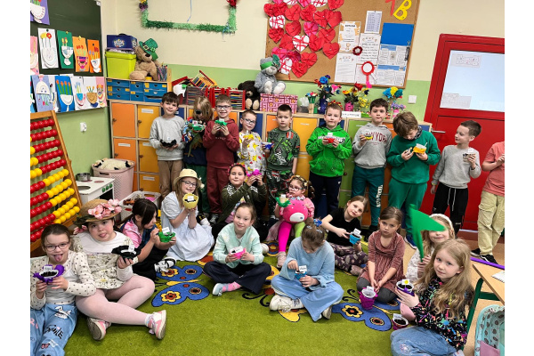 Uczniowie klasy 1b radośnie powitali nadejście wiosny. Tego dnia przyszli do szkoły ubrani bardzo kolorowo – dominowały żółte, zielone i kwiatowe stroje, okulary przeciwsłoneczne, które miały przywołać słońce i wiosenną pogodę.