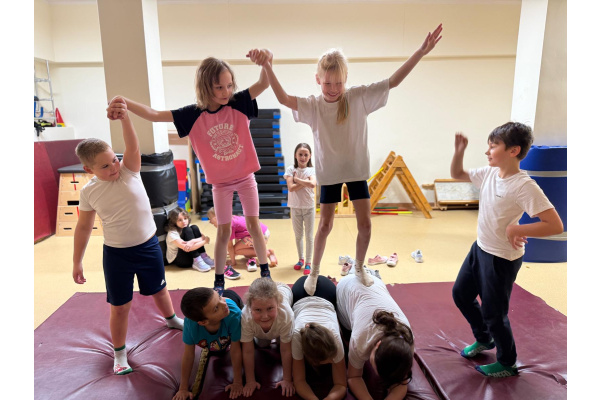 Na lekcji wychowania fizycznego w ramach zajęć z gimnastyki uczniowie klasy 3B wykonywali piramidy.