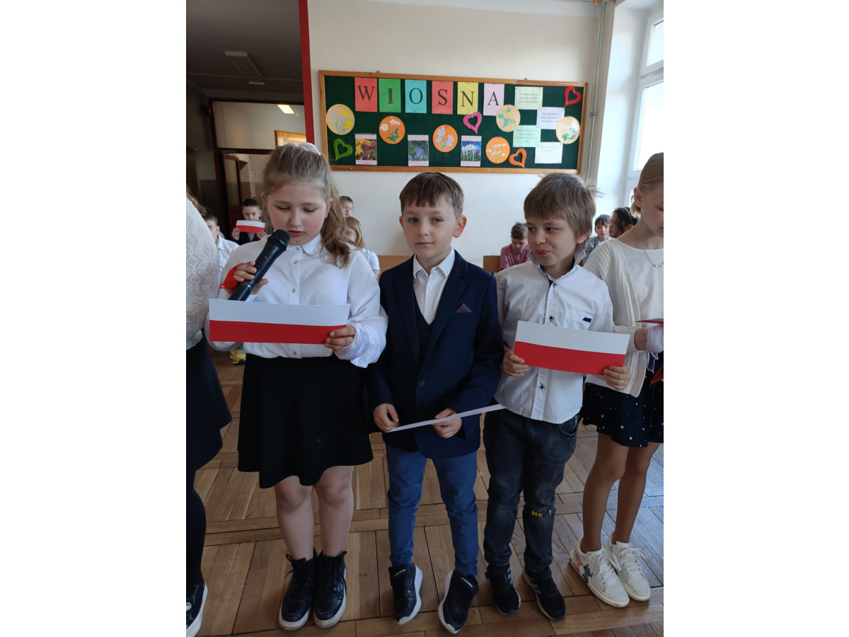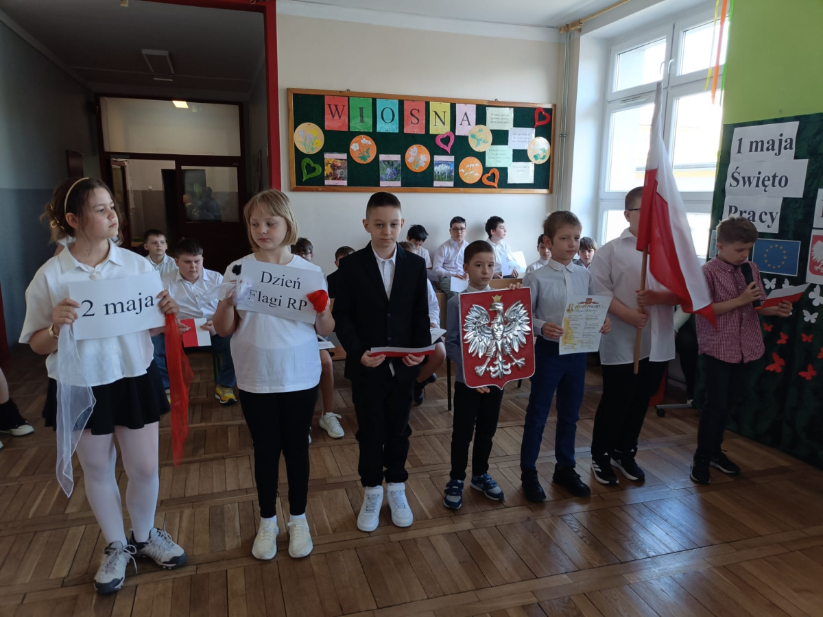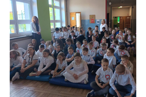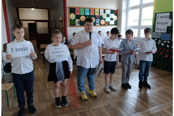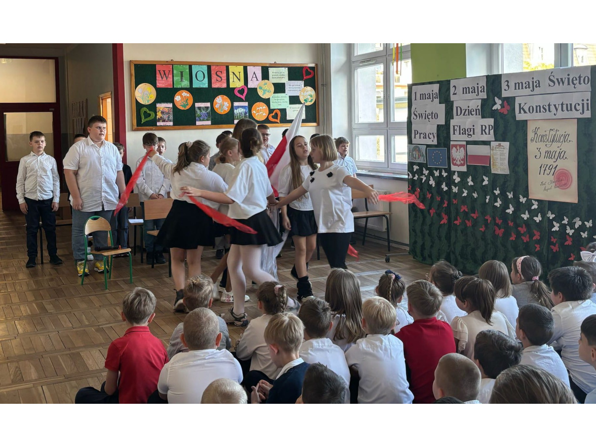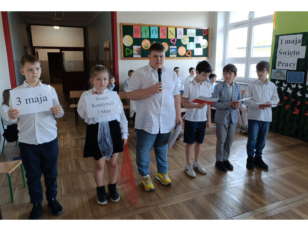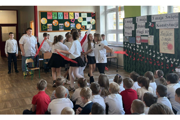 Przed majówką spotkaliśmy się na apelu. Klasa 3C przypomniała wszystkim czego dotyczą nadchodzące święta. Rozmawialiśmy o pracy, Unii Europejskiej, symbolach narodowych i oczywiście o Konstytucji 3 Maja. Wspólnie zaśpiewaliśmy też patriotyczne piosenki.
