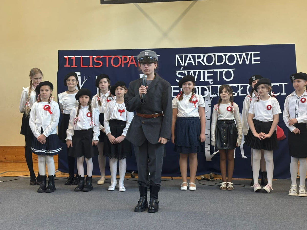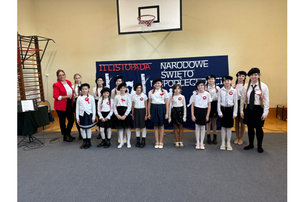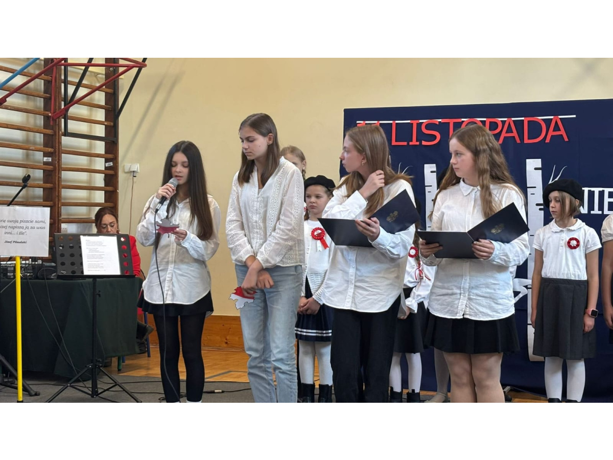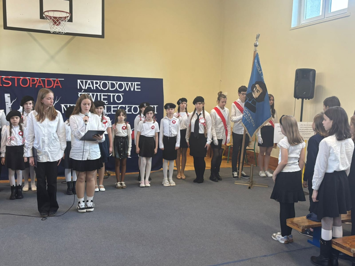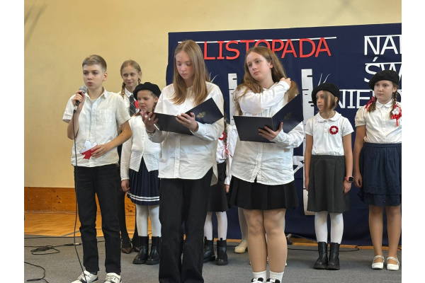 Uczniowie usłyszeli krótką historię losów naszego państwa od czasów zaborów, odzyskania przez Polskę niepodległości 11.11.1918 roku, po czasy II wojny światowej. Występujący recytowali wiersze, a piosenki patriotyczne wykonywał zespół wokalny Pani Kariny Kaczmarek.