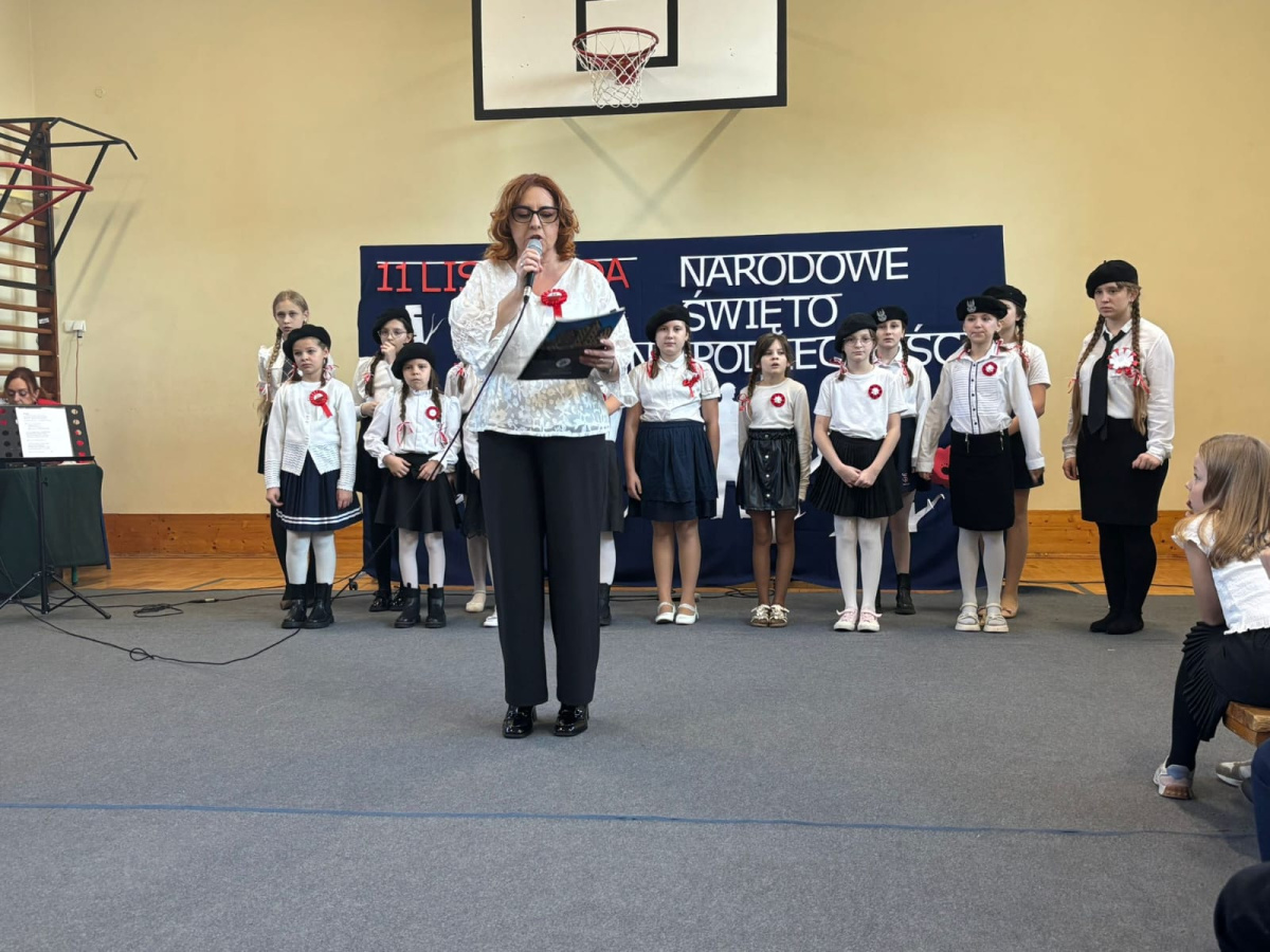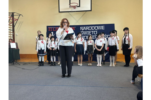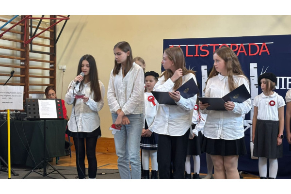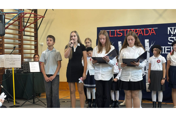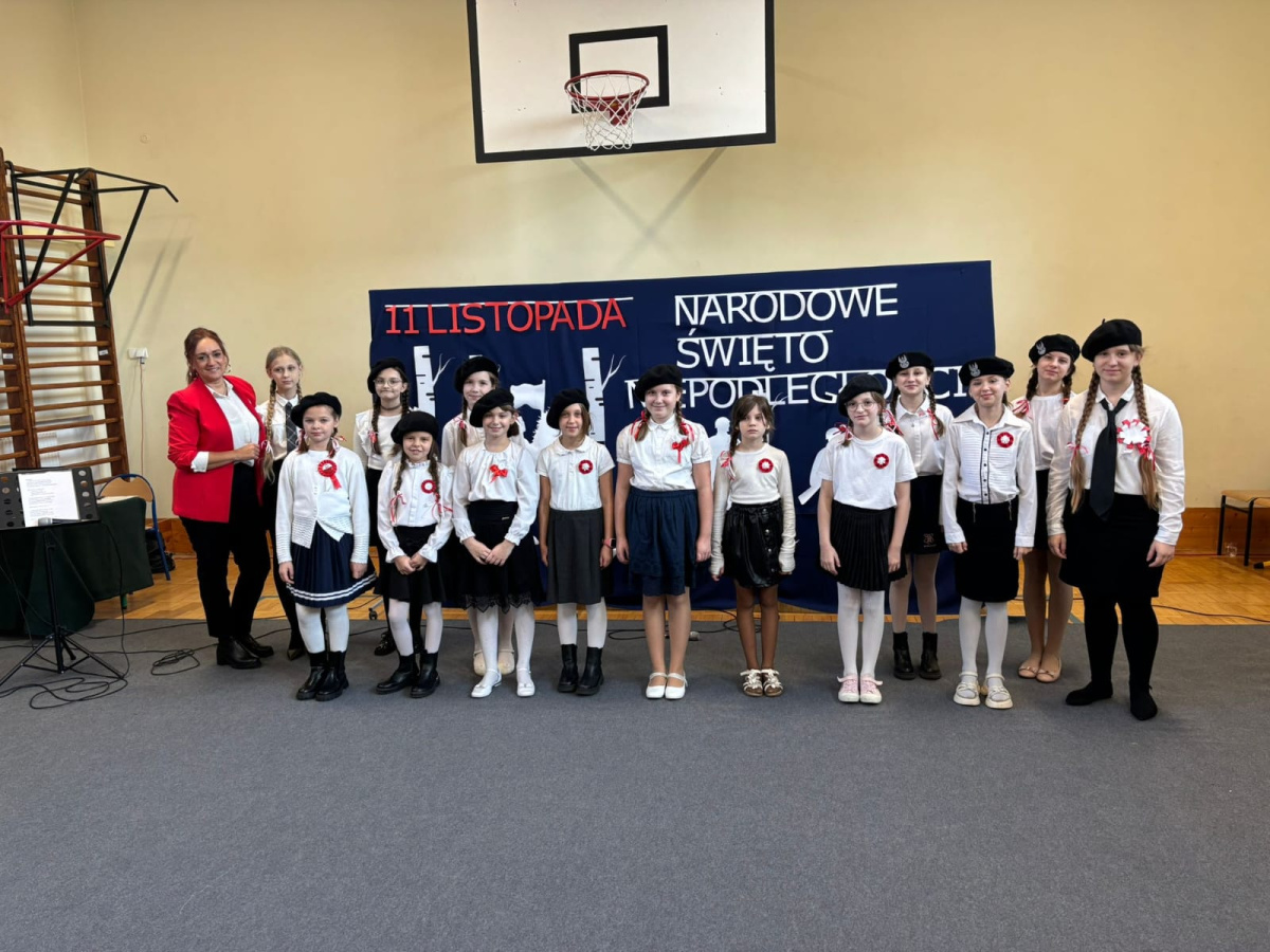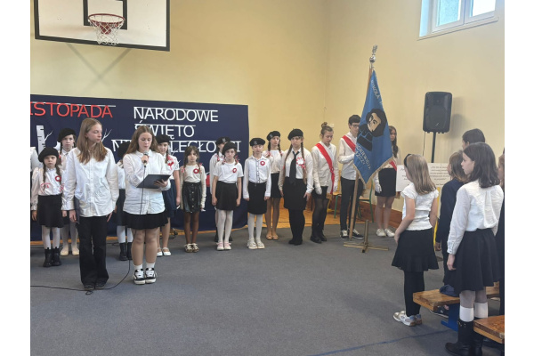 Uczniowie usłyszeli krótką historię losów naszego państwa od czasów zaborów, odzyskania przez Polskę niepodległości 11.11.1918 roku, po czasy II wojny światowej. Występujący recytowali wiersze, a piosenki patriotyczne wykonywał zespół wokalny Pani Kariny Kaczmarek.
