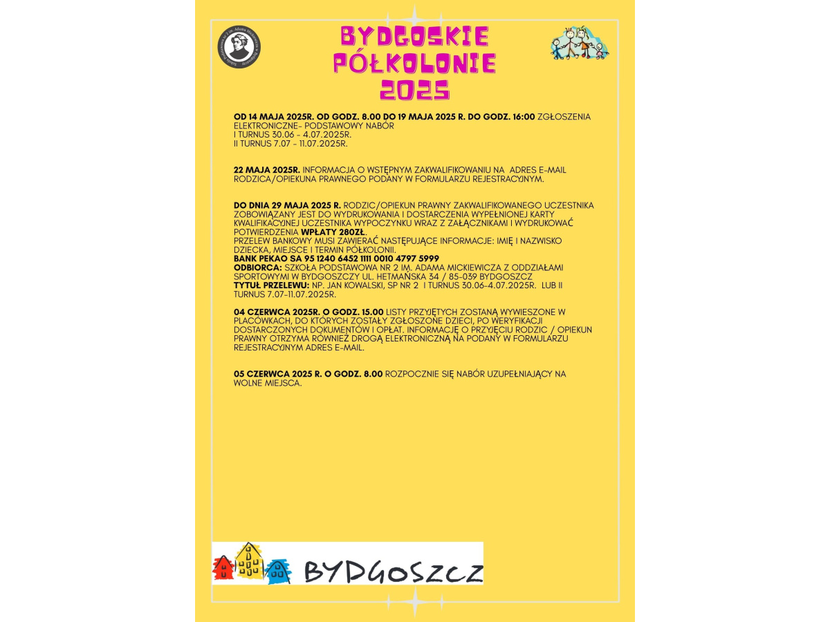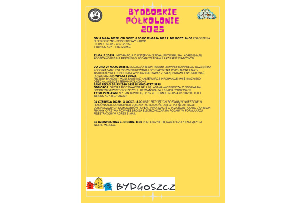 Rodzic/opiekun prawny zakwalifikowanego uczestnika zobowiązany jest do wydrukowania i dostarczenia wypełnionej karty kwalifikacyjnej uczestnika wypoczynku wraz z załącznikami i wydrukować potwierdzenia wpłaty 280zł. Przelew bankowy musi zawierać następujące informacje: imię i nazwisko dziecka, miejsce i termin półkolonii. Bank Pekao SA 95 1240 6452 1111 0010 4797 5999 Odbiorca: Szkoła Podstawowa nr 2 im. Adama Mickiewicza z Oddziałami Sportowymi w Bydgoszczy ul. Hetmańska 34 / 85-039 Bydgoszcz Tytuł przelewu: np. Jan Kowalski, SP nr 2 I turnus 30.06-4.07.2025r. lub II turnus 7.07-11.07.2025r.