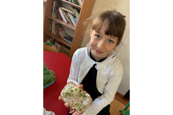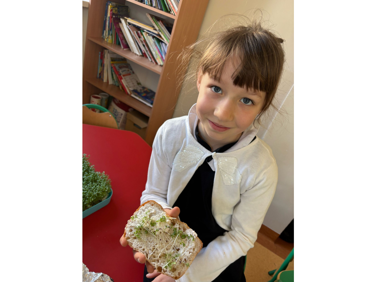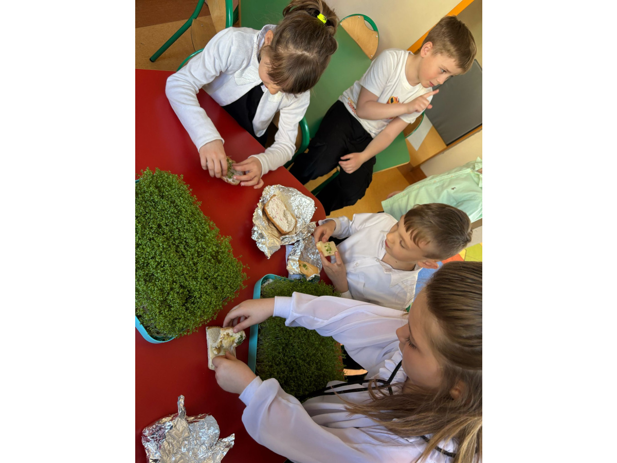 Hodowlę rzeżuchy dzieci rozpoczęły od wysiania nasion do pojemników wypełnionych watą. Każdego dnia pielęgnowały rzeżuchę delikatnie ją zraszając. Obserwowały jak kiełkują nasiona i jak rzeżucha rośnie. Już po tygodniu wyrosła zielona rzeżuchowa łączka. Naszą rzeżuchą na kanapkach zajadali się smakowicie, niektórzy pierwszy raz próbując nowego smaku :)