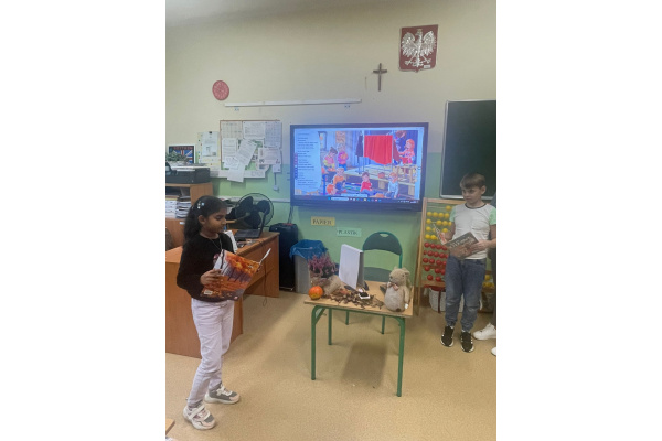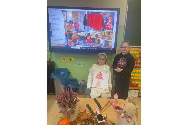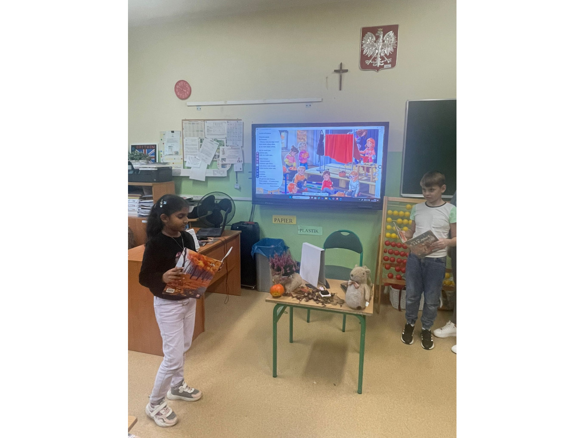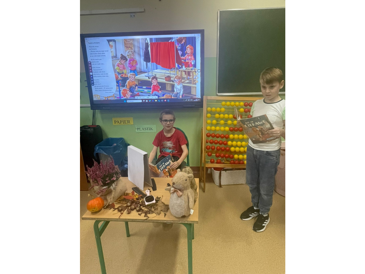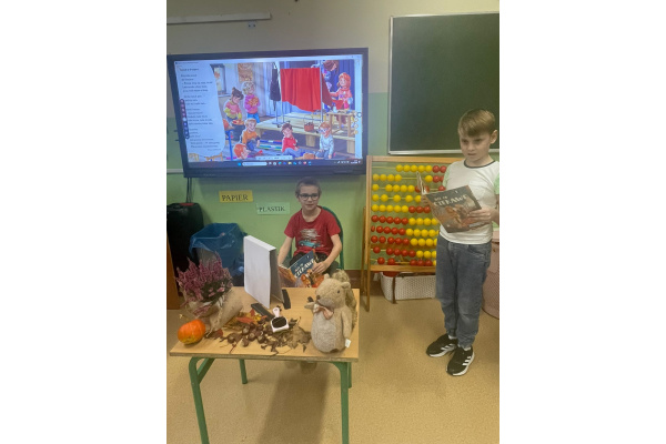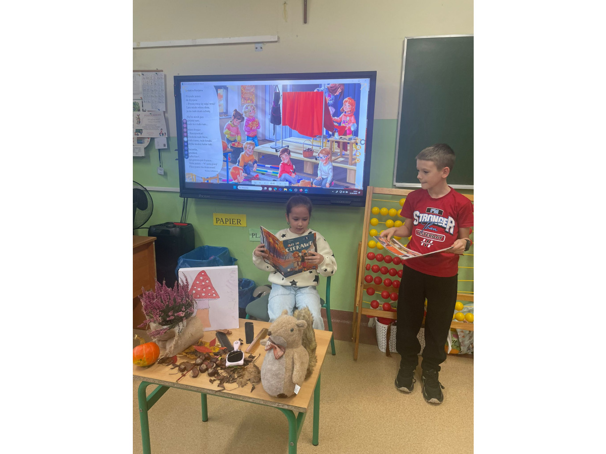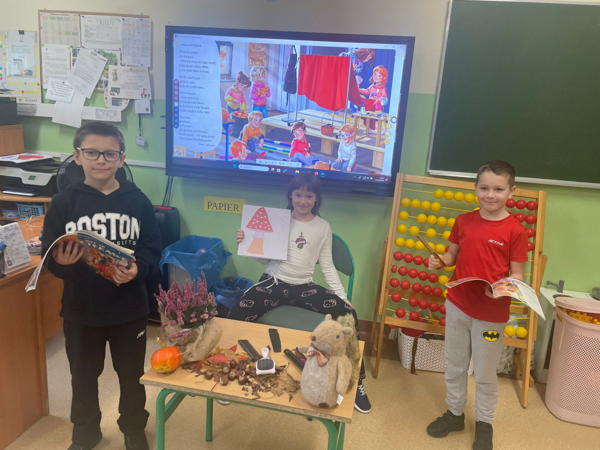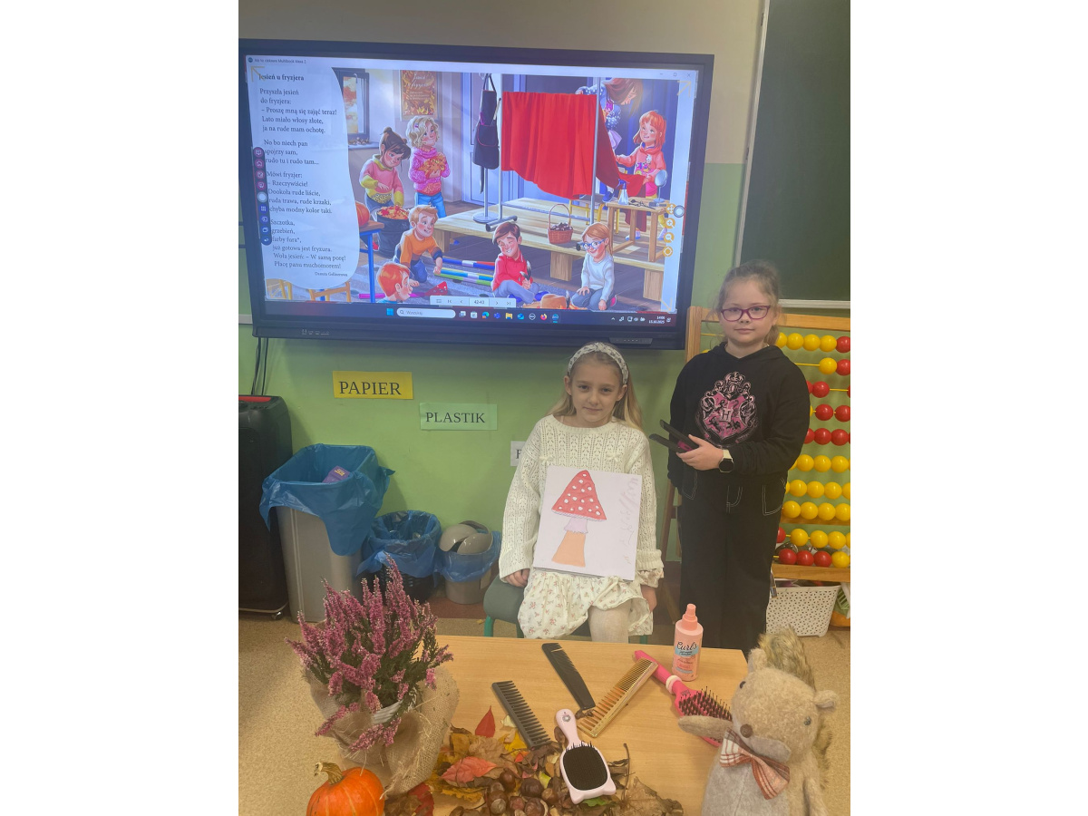 Dziś na lekcjach rozmawialiśmy o jesieni. Omawialiśmy jakie barwy przybiera jesień i jakie zmiany zachodzą w przyrodzie. Zainspirowani wierszem Danuty Gellnerowej „ Jesień u fryzjera” postanowiliśmy stworzyć swój mały klasowy teatrzyk. Uczniowie wcielali się w rolę narratora, Pani Jesieni i fryzjera. Ćwiczyliśmy czytanie a przy tym bawiliśmy się wspaniale!!