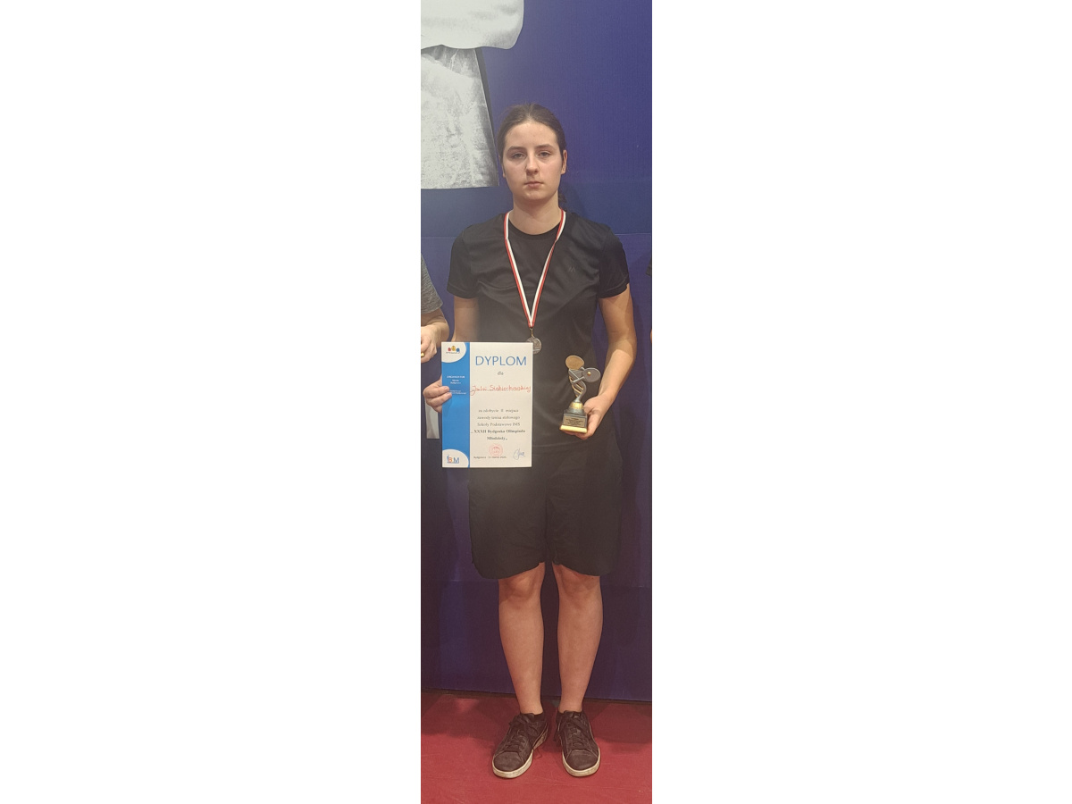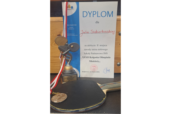 W dniu 11.03.2025r uczniowie z klasy 8a i 8b wzięli udział w mistrzostwach Bydgoszczy w tenisie stołowym (indywidualne) w ramach XXXII Bydgoskiej Olimpiady Młodzieży. Wszyscy dzielnie walczyli i grali na bardzo wysokim poziomie. Nie było łatwo... Jednak Julka Siekierkowska z kl.8b zdobyła II miejsce w tych zmaganiach i tym samym zdobyła v-ce mistrzostwo Bydgoszczy dziewcząt. Gratulujemy Julce i życzymy dalszych sukcesów sportowych!!!