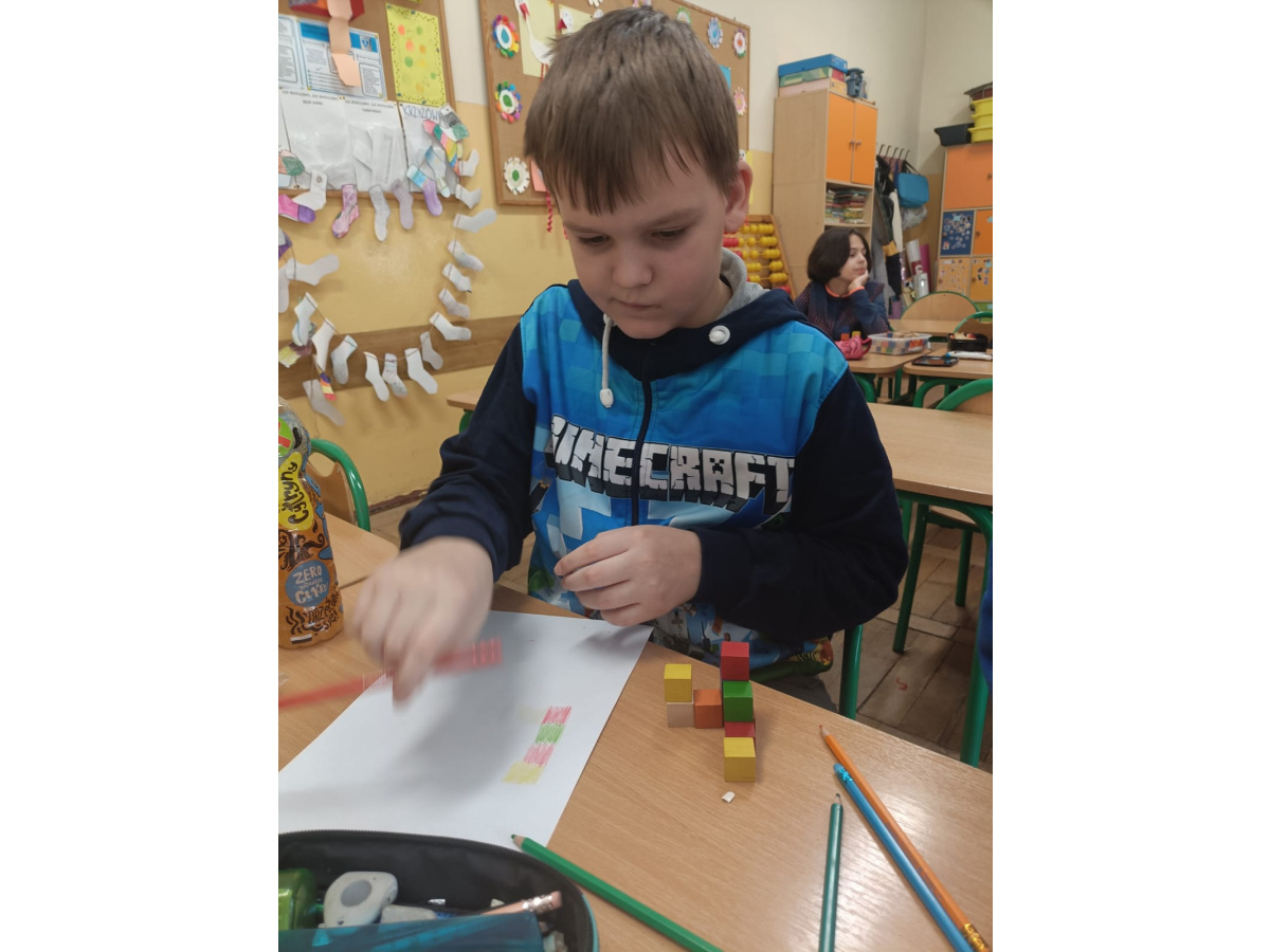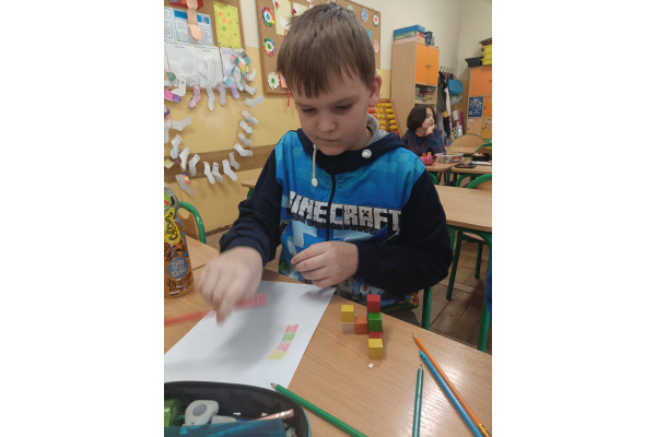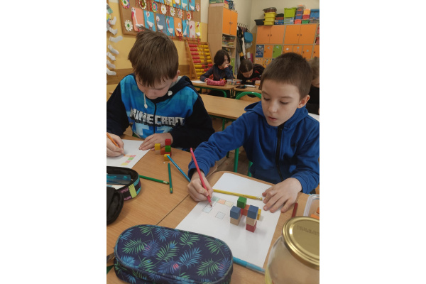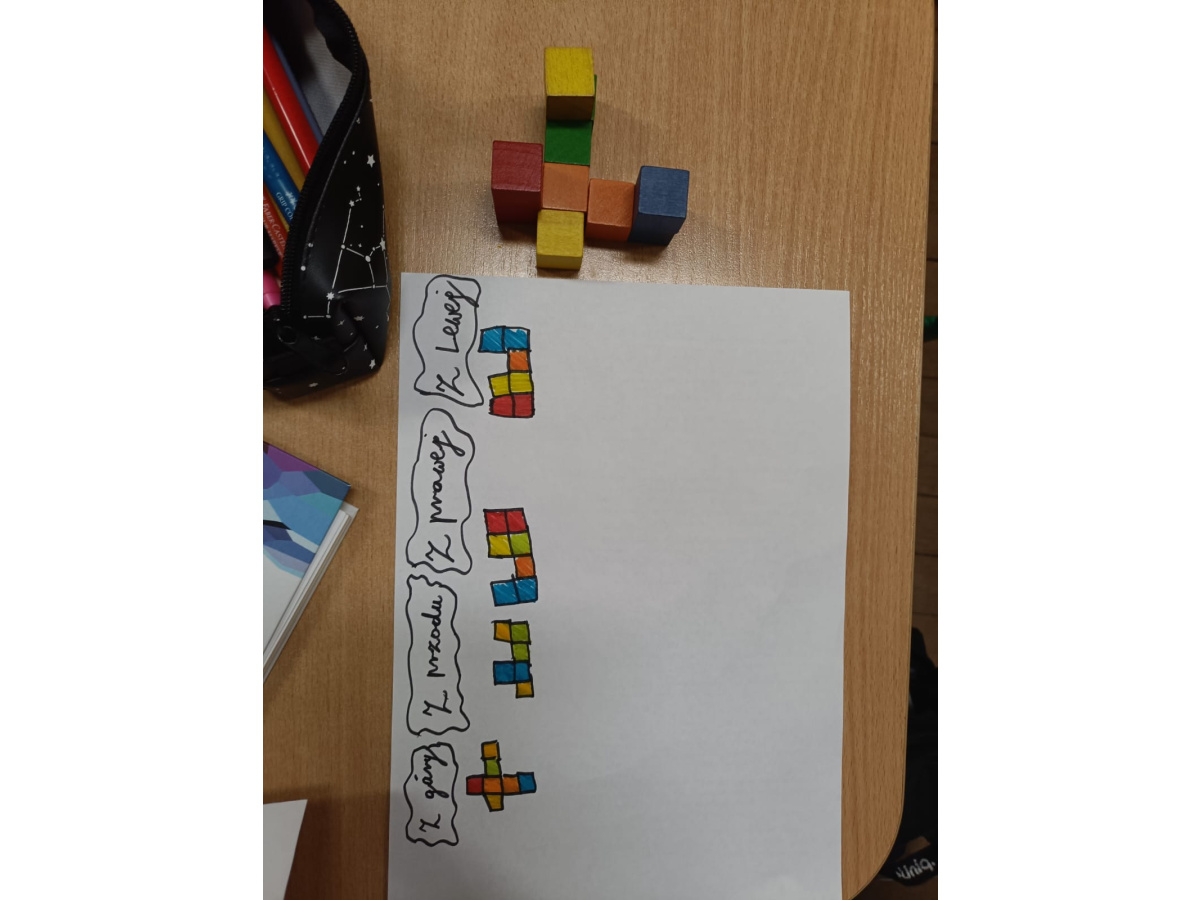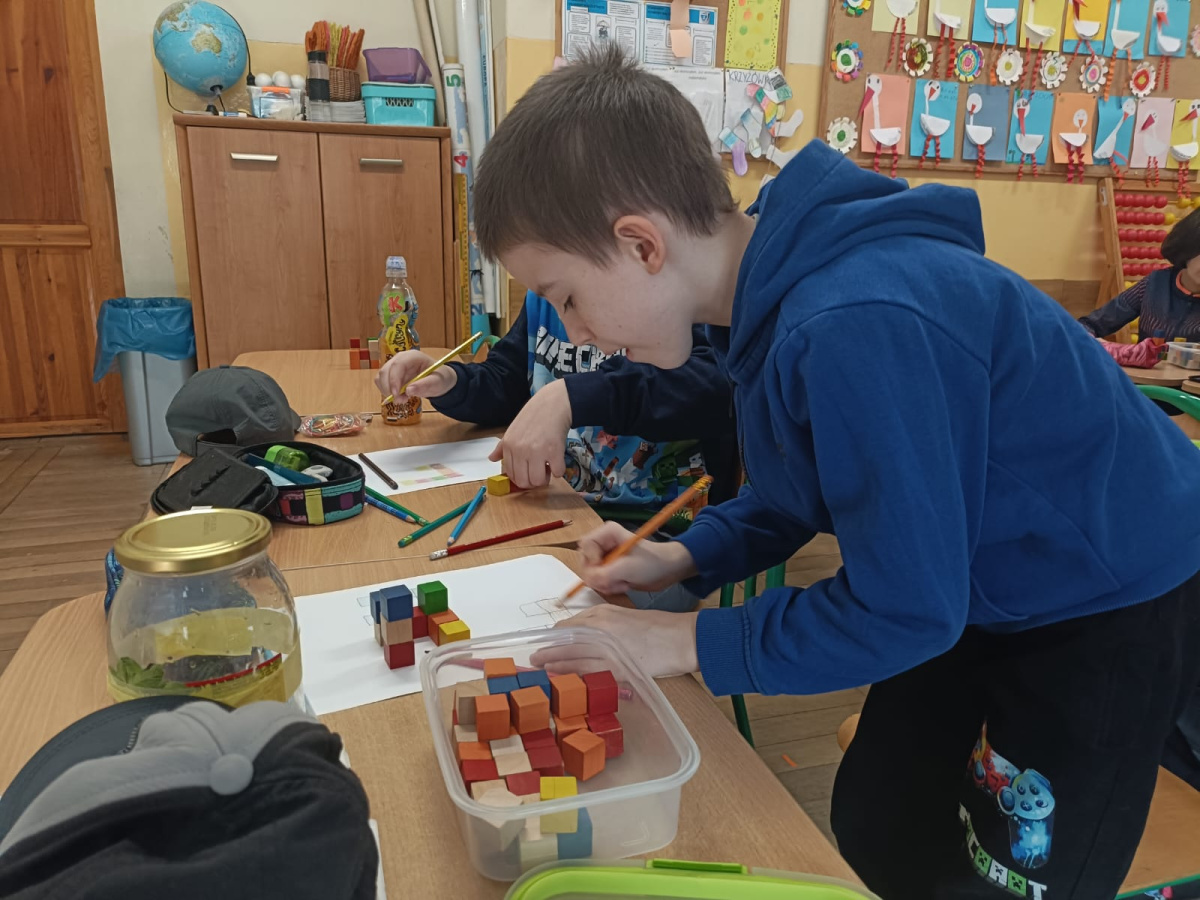 Na kole matematycznym używamy różnych pomocy do ćwiczenia naszych mózgów. Kolorowe klocki pomagają nam doskonalić myślenie przestrzenne i zmiany perspektywy.