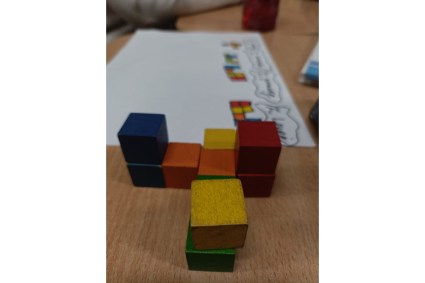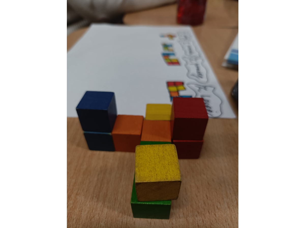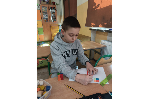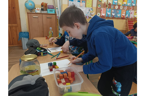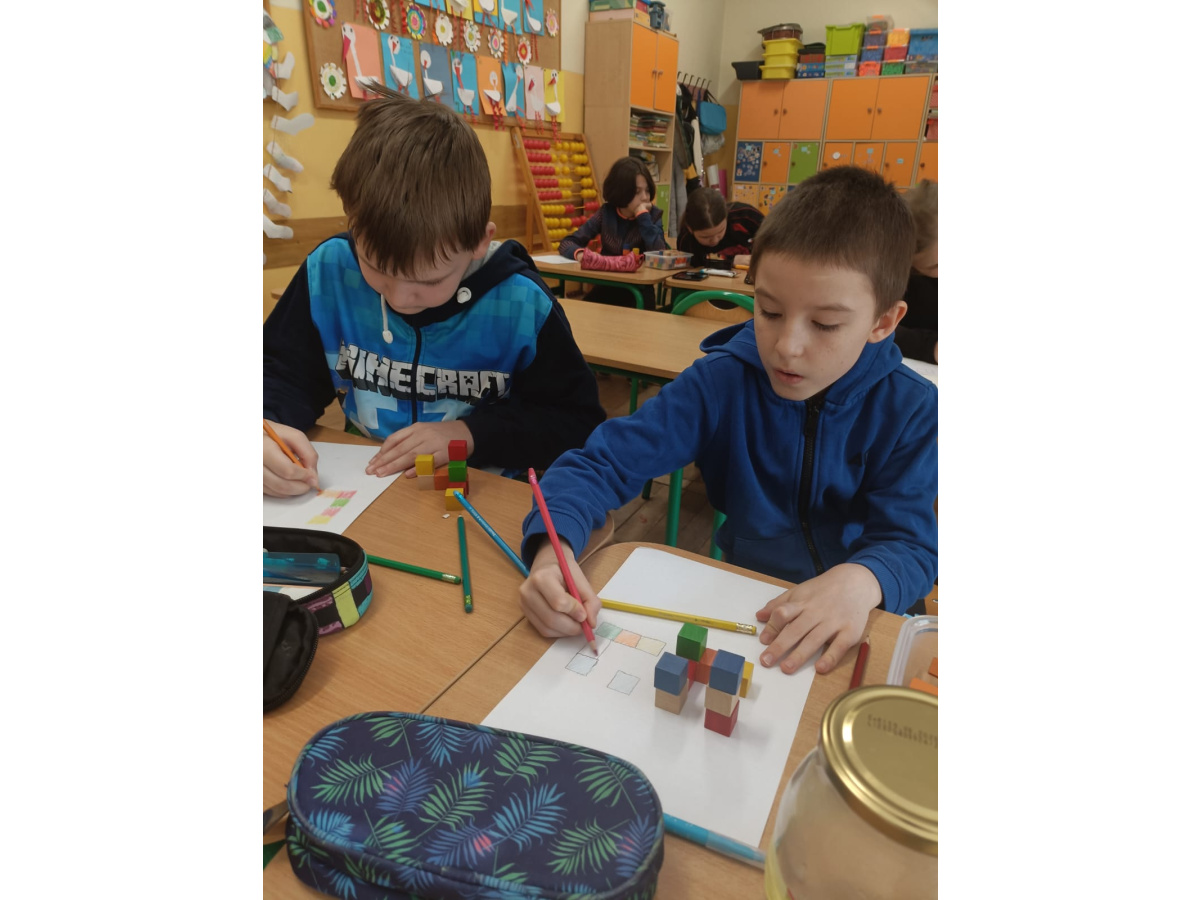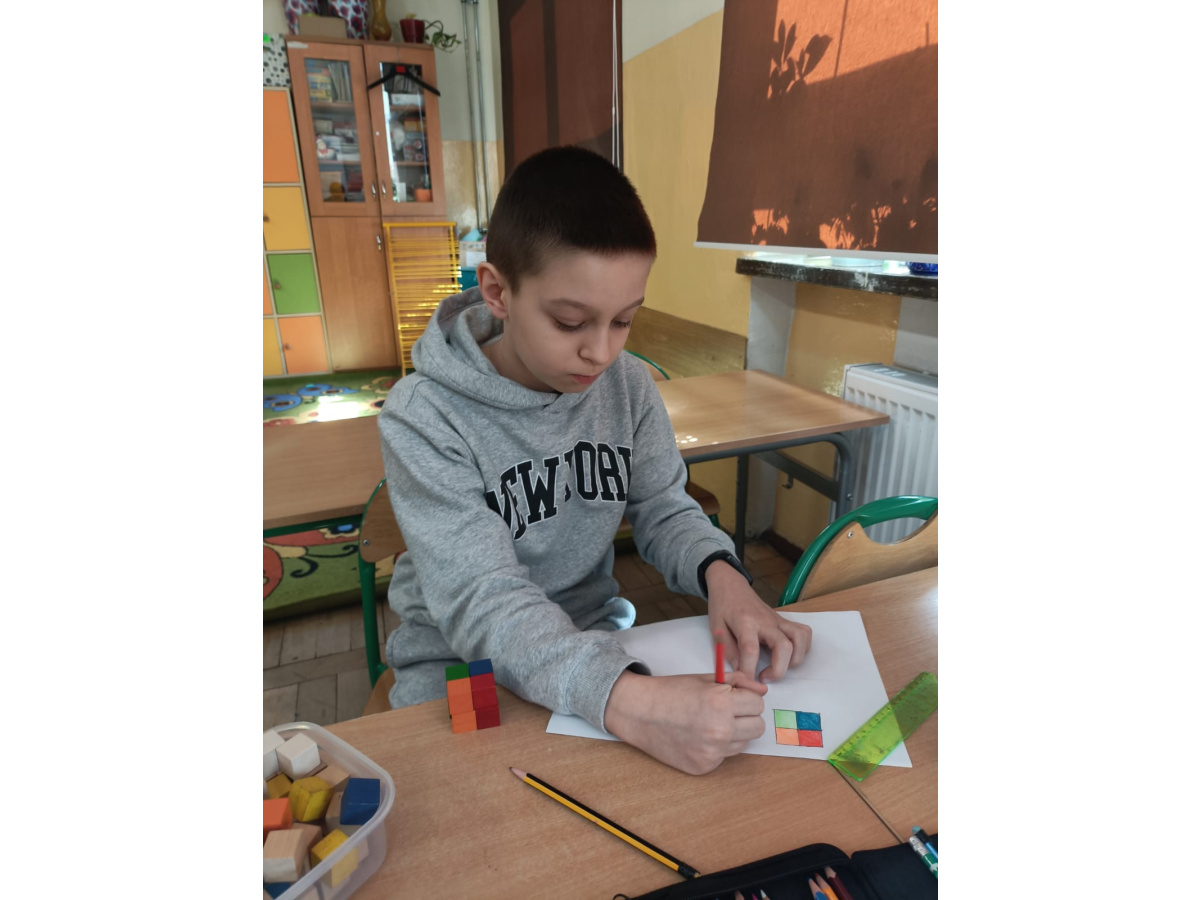 Na kole matematycznym używamy różnych pomocy do ćwiczenia naszych mózgów. Kolorowe klocki pomagają nam doskonalić myślenie przestrzenne i zmiany perspektywy.