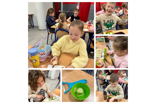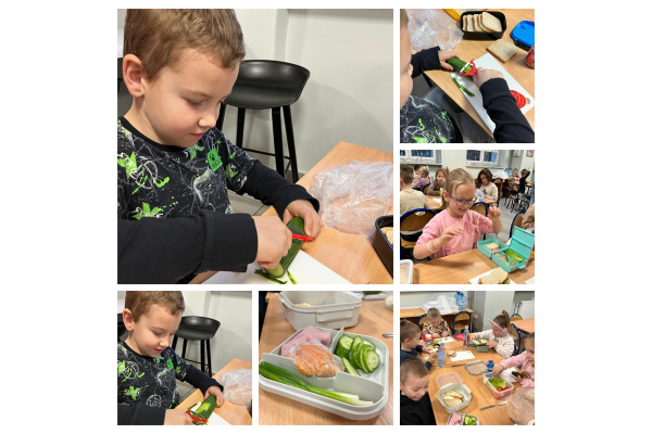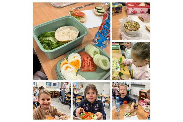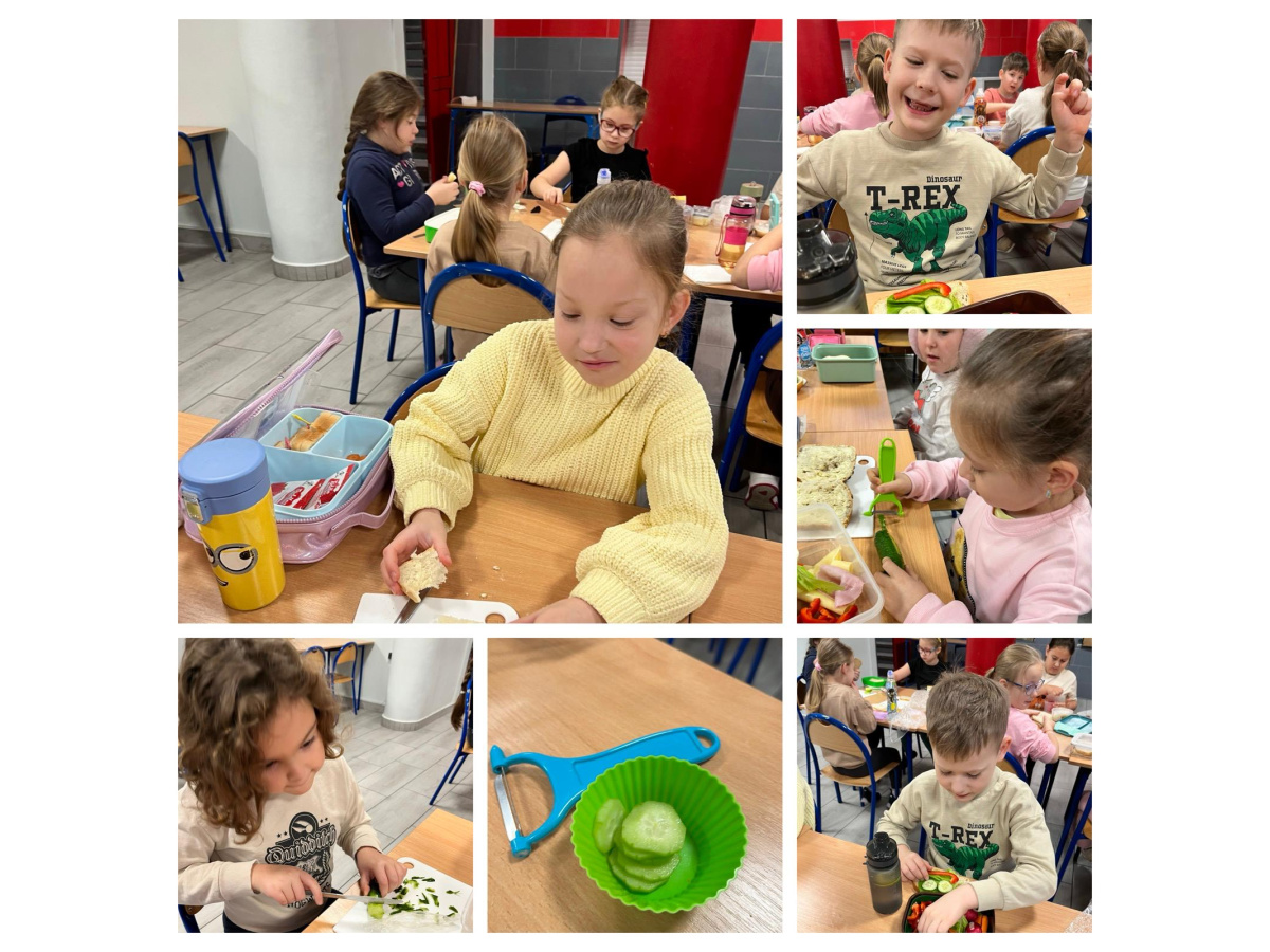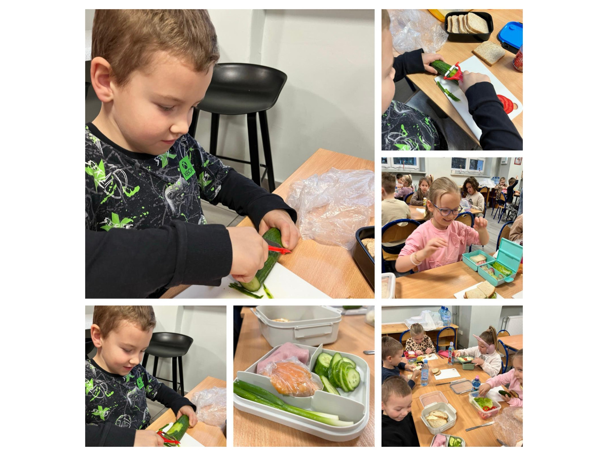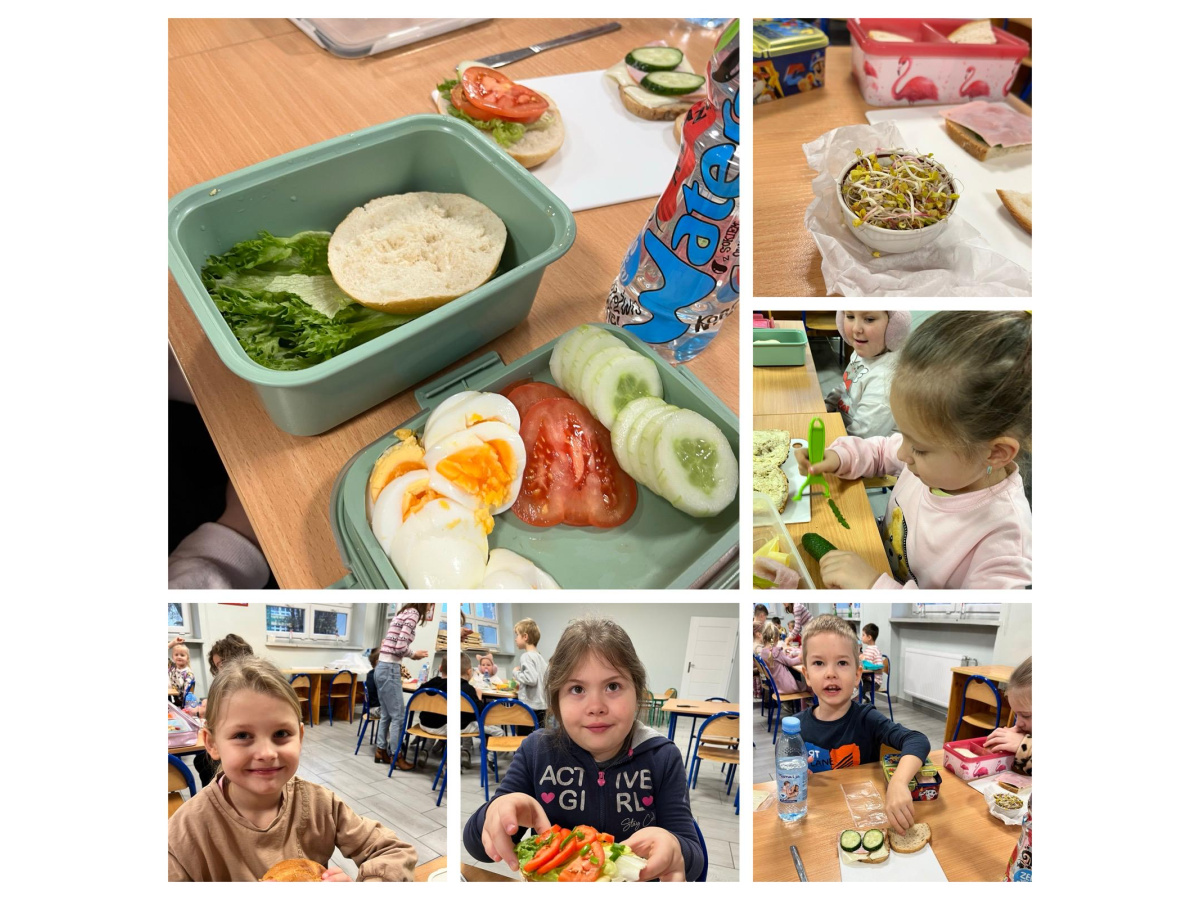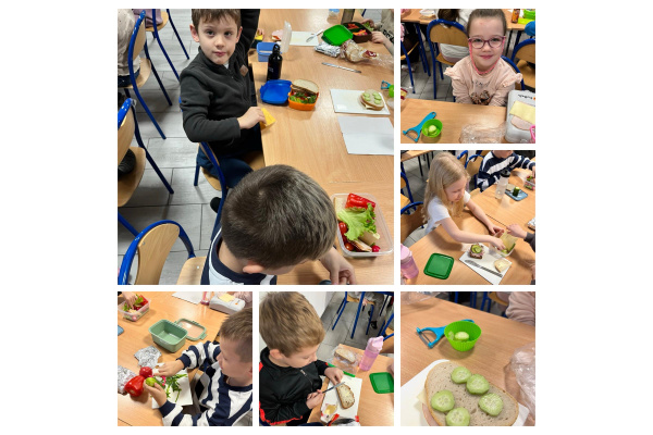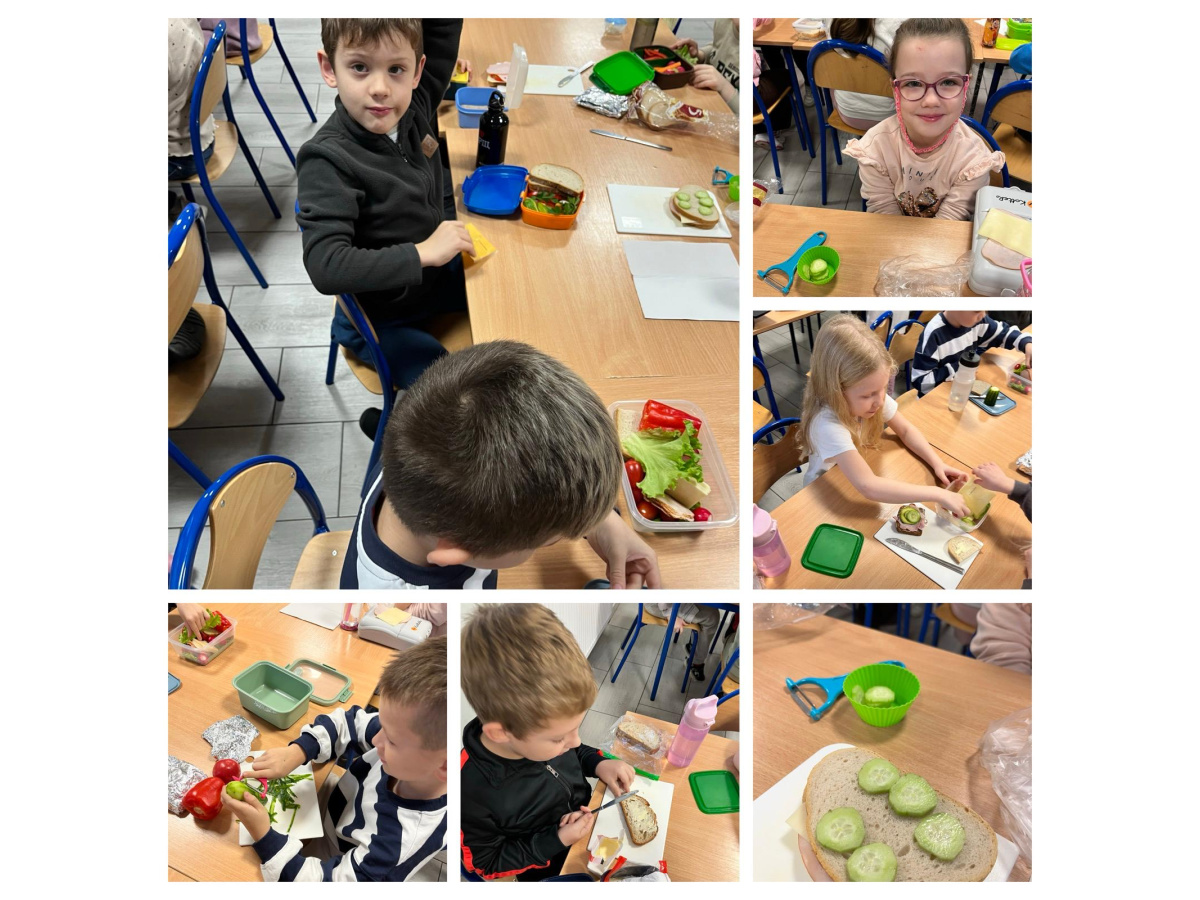 Samodzielne kanapki dla pierwszoklasisty to świetna okazja do nauki samodzielności, higieny i zdrowych nawyków żywieniowych. Aby je przygotować, dzieci z klasy 1b i 1a przyniosły zdrowe składniki, takie jak pieczywo (najlepiej pełnoziarniste), chuda wędlina, ser, jajka, warzywa (np. ogórek, pomidor, papryka, rzodkiewka) oraz dodatki jak sałata czy szczypiorek. W pracowni kulinarnej od nadzorem nauczycielek, dzieci myły ręce i samodzielnie tworzyły kanapki, dbając o higienę i porządek. Pachniało bardzo, a co najważniejsze, było zdrowo!