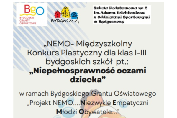 Dziękujemy za udział w Międzyszkolnym Konkursie Plastycznym pt.:"Niepełnosprawność oczami dziecka", w ramach Bydgoskiego Grantu Oświatowego - ABC Empatii- Projekt NEMO- Niezwykle Empatyczni Młodzi Obywatele. Celem konkursu było uwrażliwienie dzieci na niepełnosprawność swoich rówieśników i dorosłych. Oto wyniki: