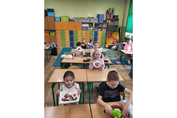 Uczniowie klasy 1a z entuzjazmem rozpoczęli wiosenną przygodę z sianiem rzeżuchy.