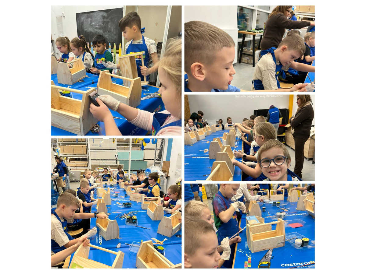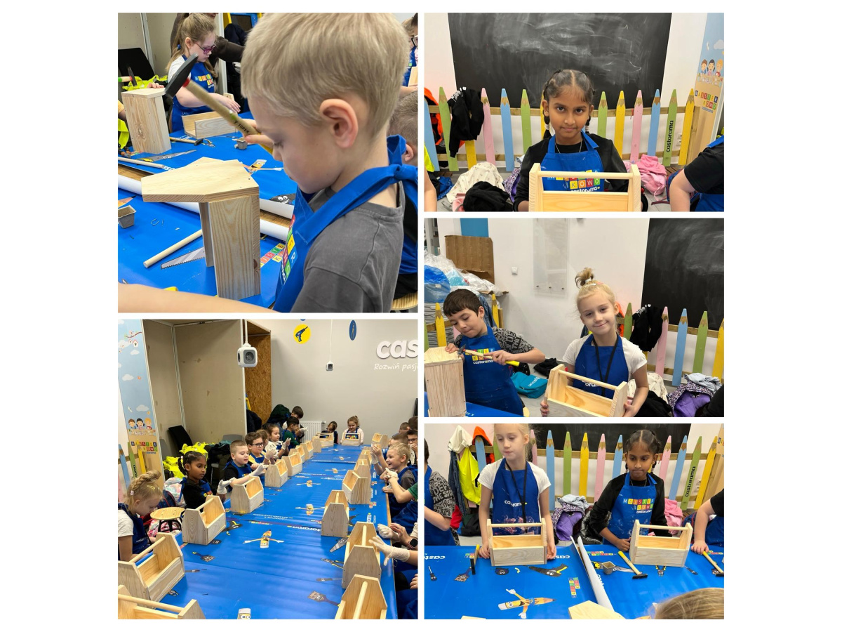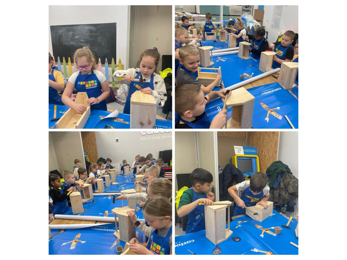 Majsterkowo to zajęcia organizowane przez Castoramę, podczas których dzieci w praktyczny i bezpieczny sposób uczą się korzystania z narzędzi. Pod okiem wykwalifikowanych prowadzących tworzą własne, proste projekty, np. karmniki dla ptaków, skrzynki czy ozdoby, korzystając z narzędzi i materiałów przygotowanych przez sklep. Uczniowie klasy 2a wykonali piękne skrzynki. Celem warsztatów jest rozwijanie kreatywności, zdolności manualnych i pracy zespołowej u dzieci. To również forma edukacji prospołecznej i prośrodowiskowej - dzieci uczą się, że majsterkowanie to nie tylko zabawa, lecz także sposób na twórcze i odpowiedzialne podejście do otaczającego świata. Zajęcia uczniom podobały się bardzo. Dziękujemy Castorama!