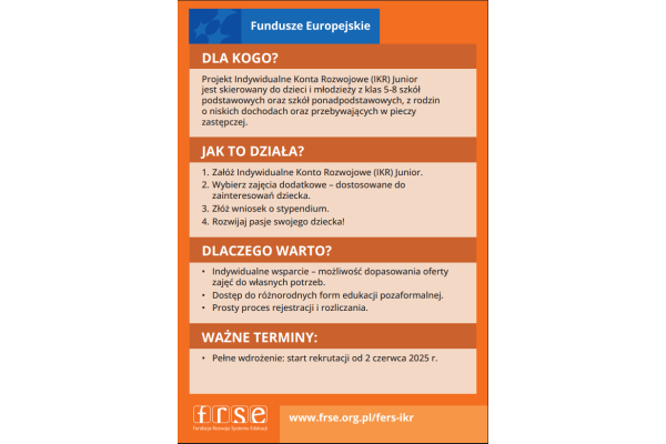Projekt Indywidualne Konta Rozwojowe (IKR) Junior to unikalna inicjatywa skierowana do uczniów i uczennic klas 5–8 szkół podstawowych oraz szkół ponadpodstawowych w całej Polsce z wyłączeniem szkół policealnych. Misją programu jest wspieranie dzieci i młodzieży z rodzin o niskich dochodach oraz umieszczonych w pieczy zastępczej, umożliwiając im rozwijanie talentów i zainteresowań poprzez realizację różnorodnych zajęć dodatkowych.