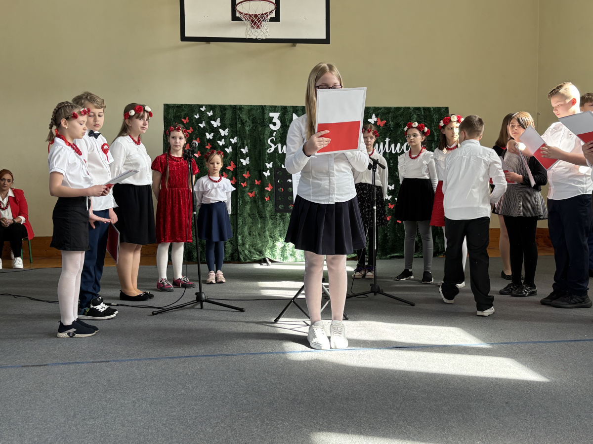 Podczas apelu uczniowie zaprezentowali montaż słowno-muzyczny, przypominający historyczne tło wydarzeń z 1791 roku. Z dumą i zaangażowaniem recytowali patriotyczne wiersze, które podkreśliły wagę wolności, jedności i miłości do ojczyzny. Wyjątkowym momentem była solowa interpretacja pieśni patriotycznej w wykonaniu Nicol Czarniak, która poruszyła całą publiczność.