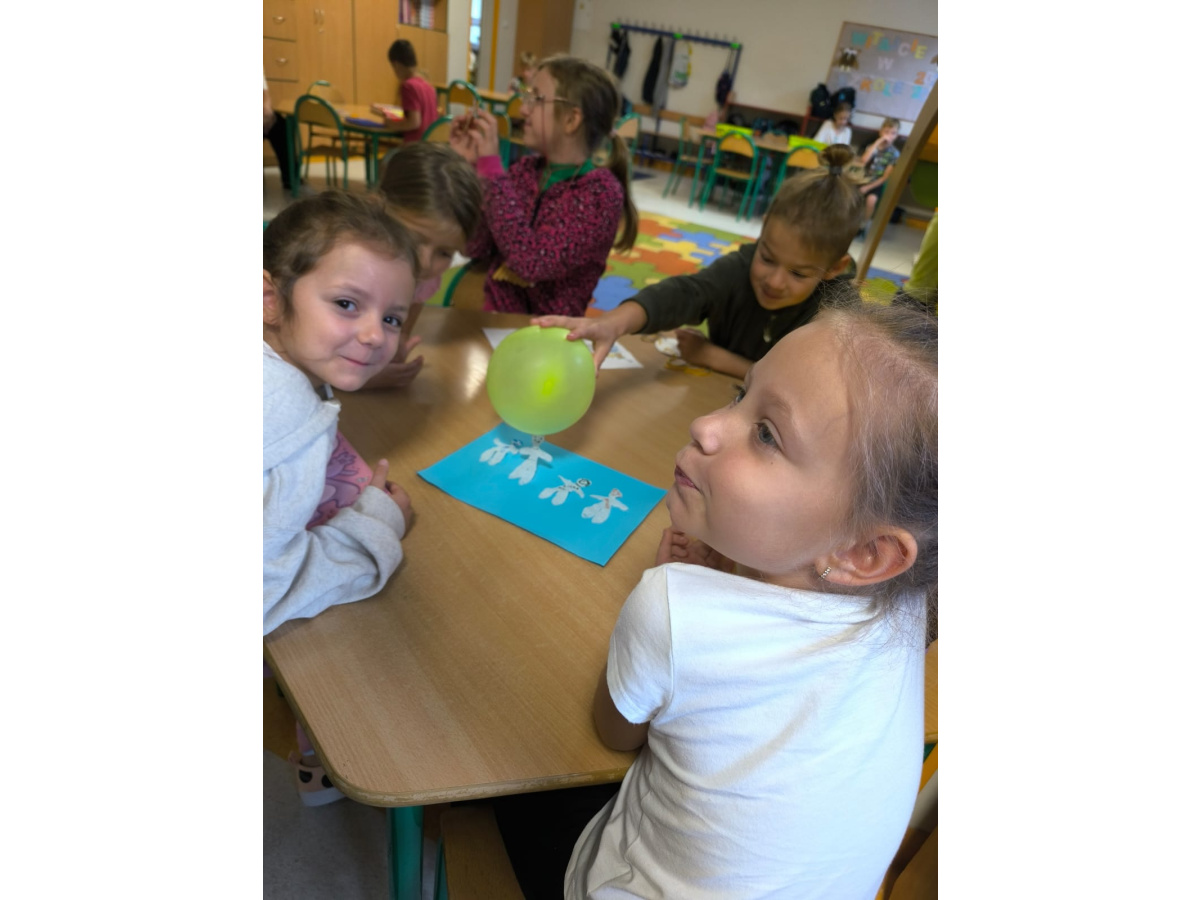Na zajęciach świetlicowych dzieci z klas 1 świetnie integrowały się, jednocześnie ucząc elementów fizyki. Sprawdzały działanie naelektryzowanego balonika na wykonane przez siebie ludziki z papieru.