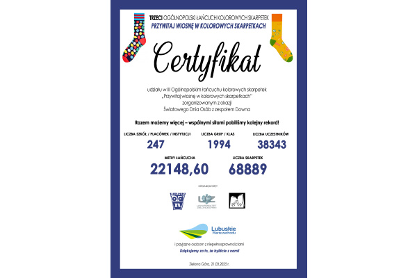 W imieniu organizatorów - Ośrodka Doskonalenia Nauczycieli w Zielonej Górze, Rady Studentów z Niepełnosprawnościami Uniwersytetu Zielonogórskiego oraz Pedagogicznej Biblioteki Wojewódzkiej im. Marii Grzegorzewskiej w Zielonej Górze serdecznie dziękuję za udział w trzeciej edycji Ogólnopolskiego Happeningu „Przywitaj wiosnę w kolorowych skarpetkach”.