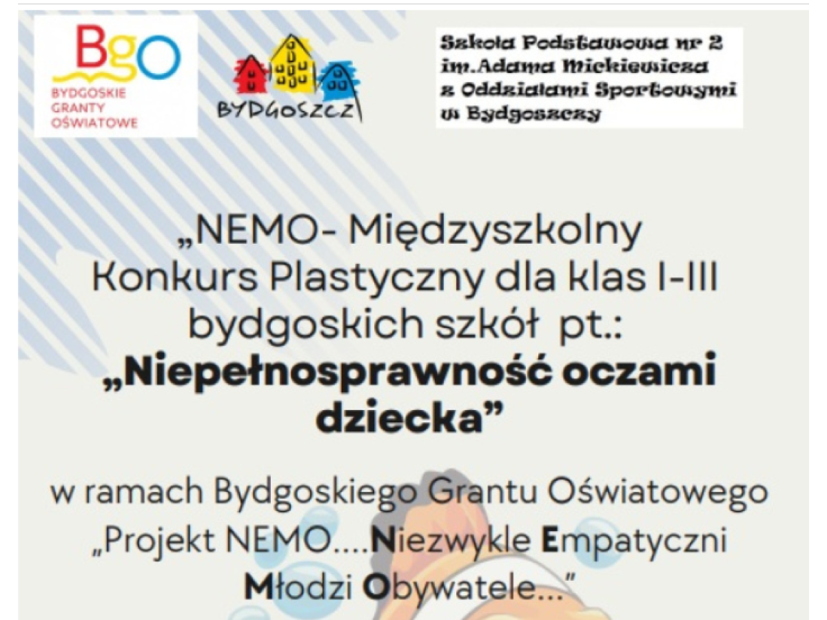 Dziękujemy za udział w Międzyszkolnym Konkursie Plastycznym pt.:"Niepełnosprawność oczami dziecka", w ramach Bydgoskiego Grantu Oświatowego - ABC Empatii- Projekt NEMO- Niezwykle Empatyczni Młodzi Obywatele. Celem konkursu było uwrażliwienie dzieci na niepełnosprawność swoich rówieśników i dorosłych. Oto wyniki: