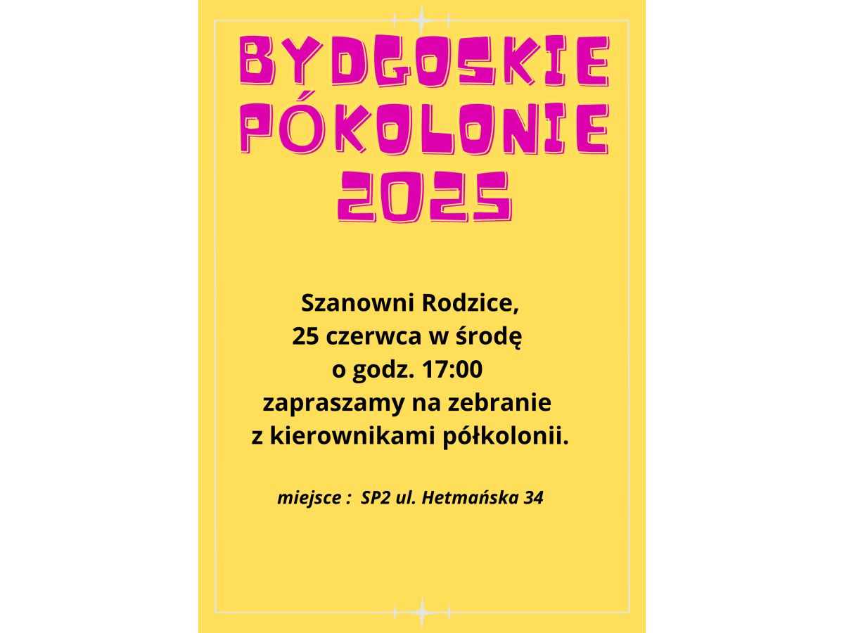 Zapraszamy na zebranie z Rodzicami dzieci uczęszczających na półkolonie bydgoskie.