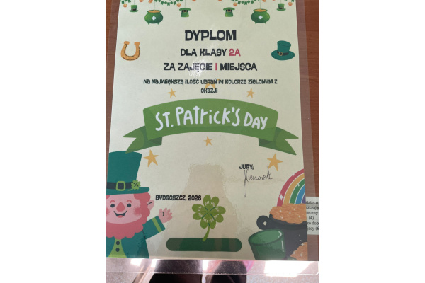 Klasa 2a zajęła 1. miejsce w szkolnej zabawie z okazji Dnia Świętego Patryka za największą liczbę ubrań w kolorze zielonym.