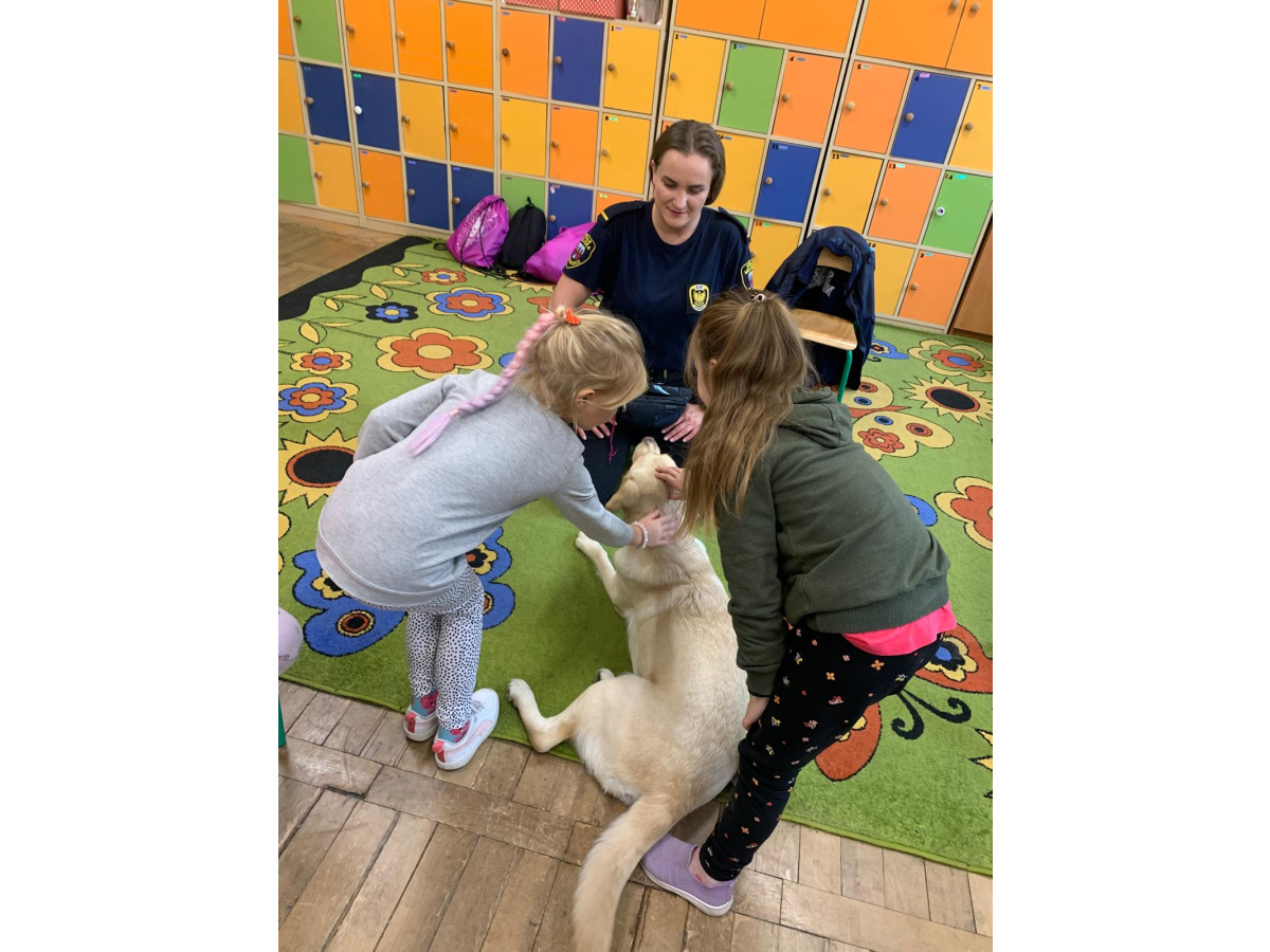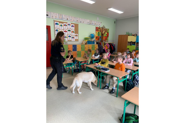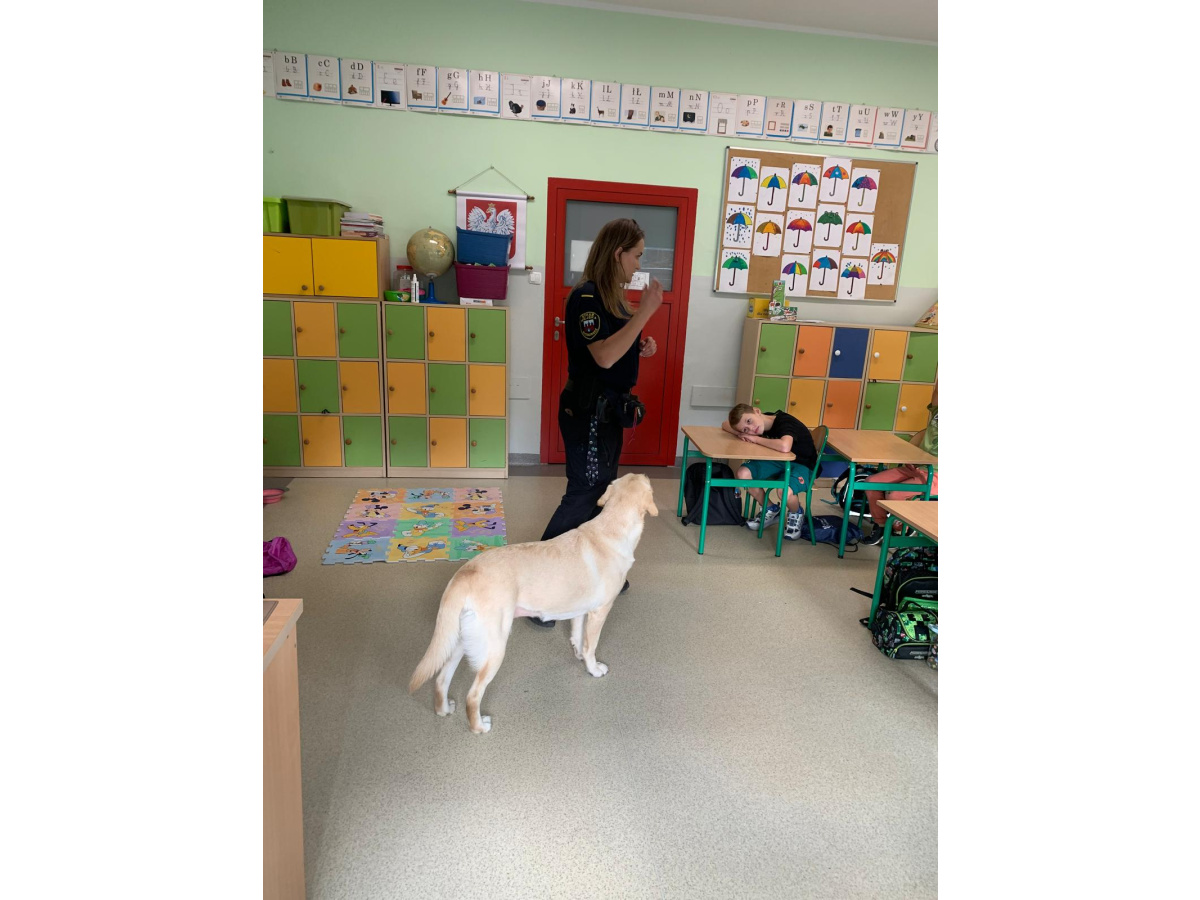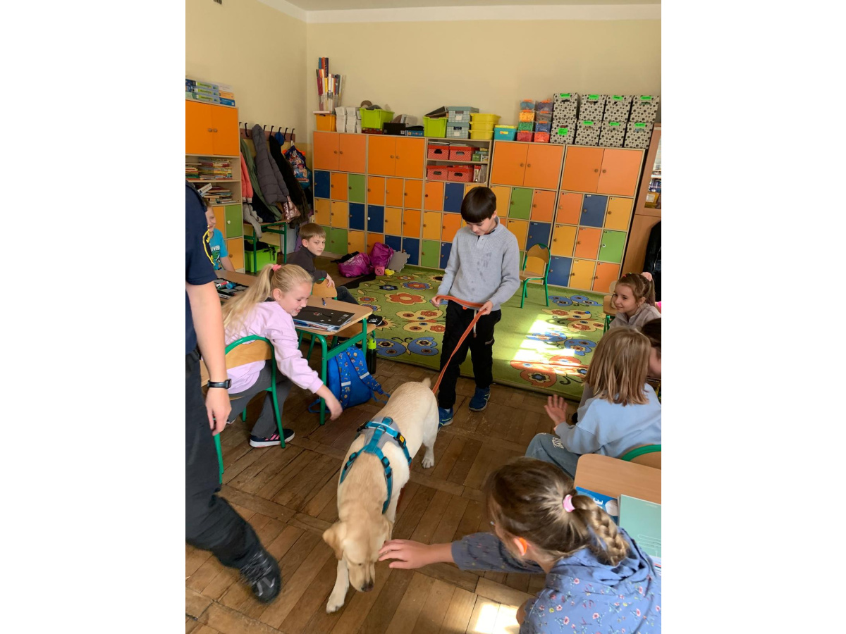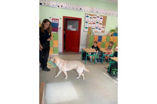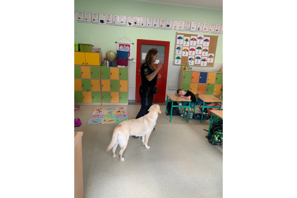 Labradorka LABI - razem ze swoją partnerką ze Straży Miejskiej gości na zajęciach w klasach 1-3. Labradorka, która ma na imię LABI jest psem terapeutycznym - uczy dzieci żeby ich kontakt z pieskami był bezpieczny. Żeby dzieci wiedziały jak się zachować w kontakcie z pieskiem: np. Czy zawsze można psa głaskać? Jak dbać o pieska? Jak sprawić mu radość? W naszej szkole wszyscy bardzo lubimy LABI, znają ją młodsi i starsi. Zawsze wywołuje uśmiechy na twarzach i wnosi mnóstwo radości.